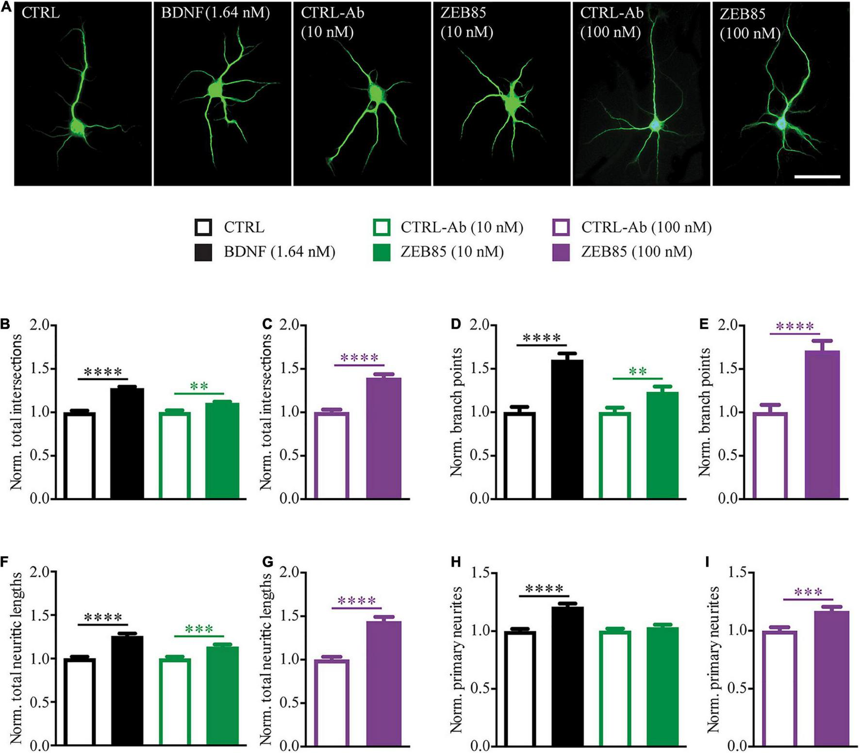 Figure 1. ZEB85 increases neurite complexity of developing hippocampal neurons. Primary hippocampal neurons DIV3 were treated for 4 days with ZEB85 (10 nM and 100 nM), control-antibody (CTRL-Ab) or with BDNF (1.64 nM) and its respective control (CTRL). (A) Representative images for the different treatment groups immunostained for MAP2 at DIV7. Scale bar, 50 μm. (B–I) Sholl analysis was performed to analyze neurite complexity and data was normalized to the respective controls: (B,C) total number of intersections, (D,E) number of branch points, (F,G) total neurite length and (H,I) number of primary neurites. (CTRL, CTRL-Ab 10 nM and ZEB85 10 nM: n = 141 neurons; BDNF: n = 140; CTRL-Ab 100 nM: n = 91; ZEB85 100 nM: n = 94; N = 3 independent experiments). The data are presented as mean ± SEM and were tested using an unpaired t-test. **p < 0.01; ***p < 0.001; ****p < 0.0001.