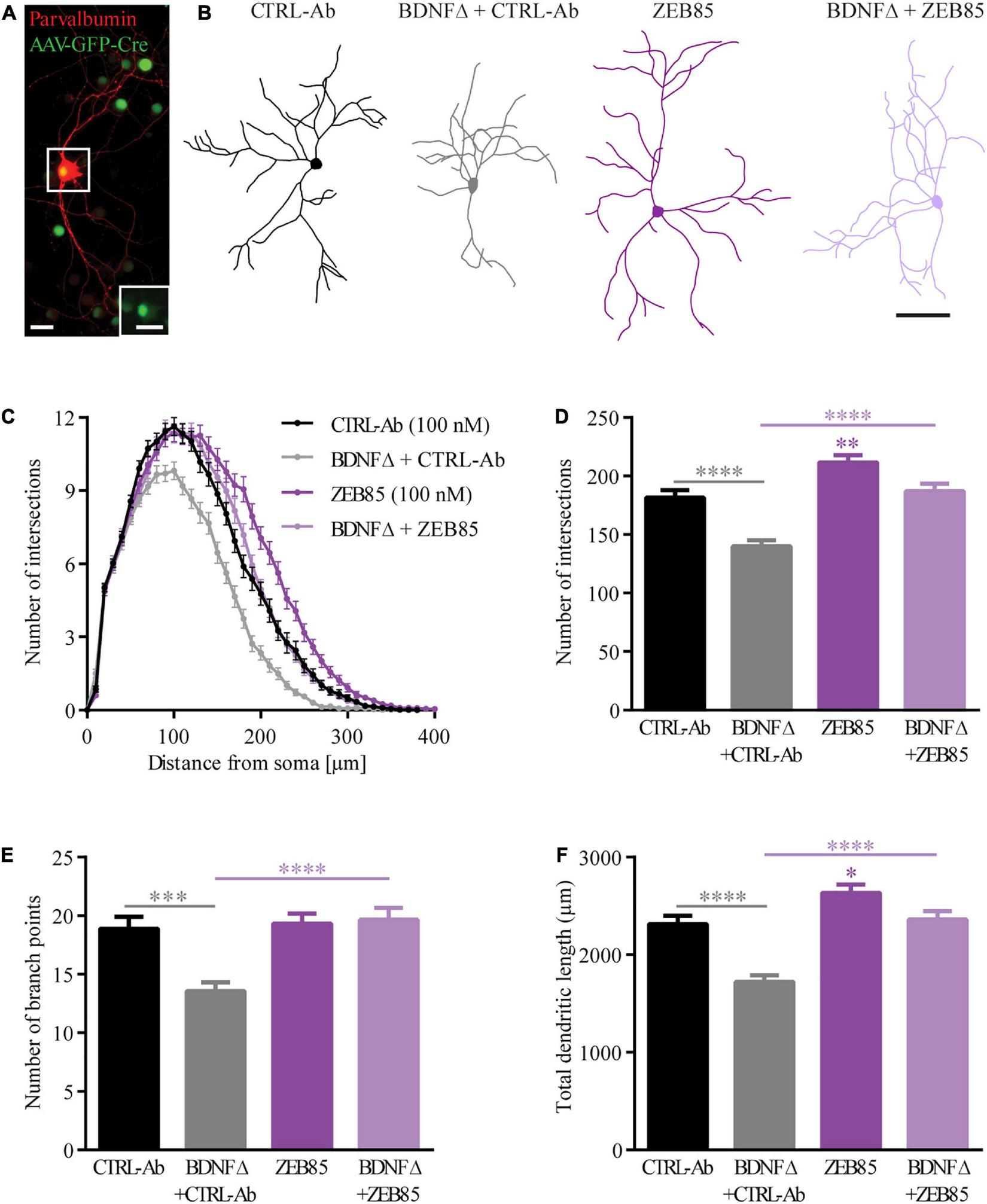 Figure 2. ZEB85 rescues the dendritic complexity of bdnf-KO PV+ interneurons. (A) Representative image of an AAV-CRE-GFP transduced parvalbumin-positive (PV+) interneuron in primary BDNFfl/fl hippocampal cultures. The inserted image (dotted square) shows the nuclear GFP expression of the transfected PV+ interneuron. Both scale bars, 25 μm. (B) Neurolucida tracings used for Sholl analysis from PV+ interneurons DIV21 treated at DIV0 with ZEB85 (100 nM) or control-antibody (CTRL-Ab) either BDNF-depleted (BDNFΔ) or not. Scale bar, 100 μm. (C) Sholl analysis curves, with the number of intersections plotted against the distance from the cell body. Graphs show the (D) total number of intersections, (E) number of branch points and (F) total dendritic length of PV+ interneurons. (CTRL-Ab, ZEB85 and BDNFΔ + ZEB85: n = 74 neurons; BDNFΔ + CTRL-Ab: n = 75; N = 3 independent experiments). The data are presented as mean ± SEM and were tested using a (C) repeated measures two-way ANOVA and (D–F) one-way ANOVA with Bonferroni post-test. *p < 0.05; **p < 0.01; ***p < 0.001; ****p < 0.0001.