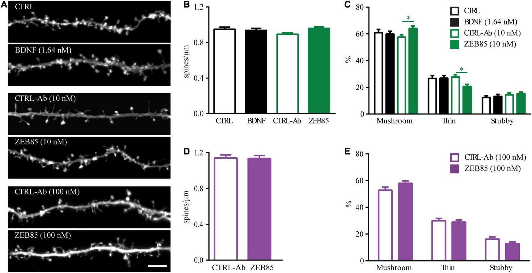 Figure 3. ZEB85 affects spine type distribution in mature primary hippocampal neurons. (A) Representative dendritic segments with dendritic spines from feGFP transfected hippocampal neurons treated for 24 h with ZEB85 (10 nM and 100 nM), BDNF and the corresponding controls. Scale bar, 5 μm. (B,D) Quantification of spine density (CTRL: n = 58 dendrites/neurons; BDNF: n = 59; CTRL-Ab 10 nM: n = 53; ZEB85 10 nM: n = 58; CTRL-Ab 100 nM: n = 45; ZEB85 100 nM: n = 44; N = 4 independent experiments). The data are presented as mean ± SEM and were tested using (B) a one-way ANOVA with Bonferroni post-test or (D) an unpaired t-test. (C,E) Quantification of spine type distribution (CTRL: n = 40; BDNF: n = 37; CTRL-Ab 10 nM: n = 52; ZEB85 10 nM: n = 52; CTRL-Ab 100 nM: n = 28; ZEB85 100 nM: n = 27; N = 3 independent experiments). The data are presented as mean ± SEM and were tested using a two-way ANOVA with Bonferroni post-test. *p < 0.05.