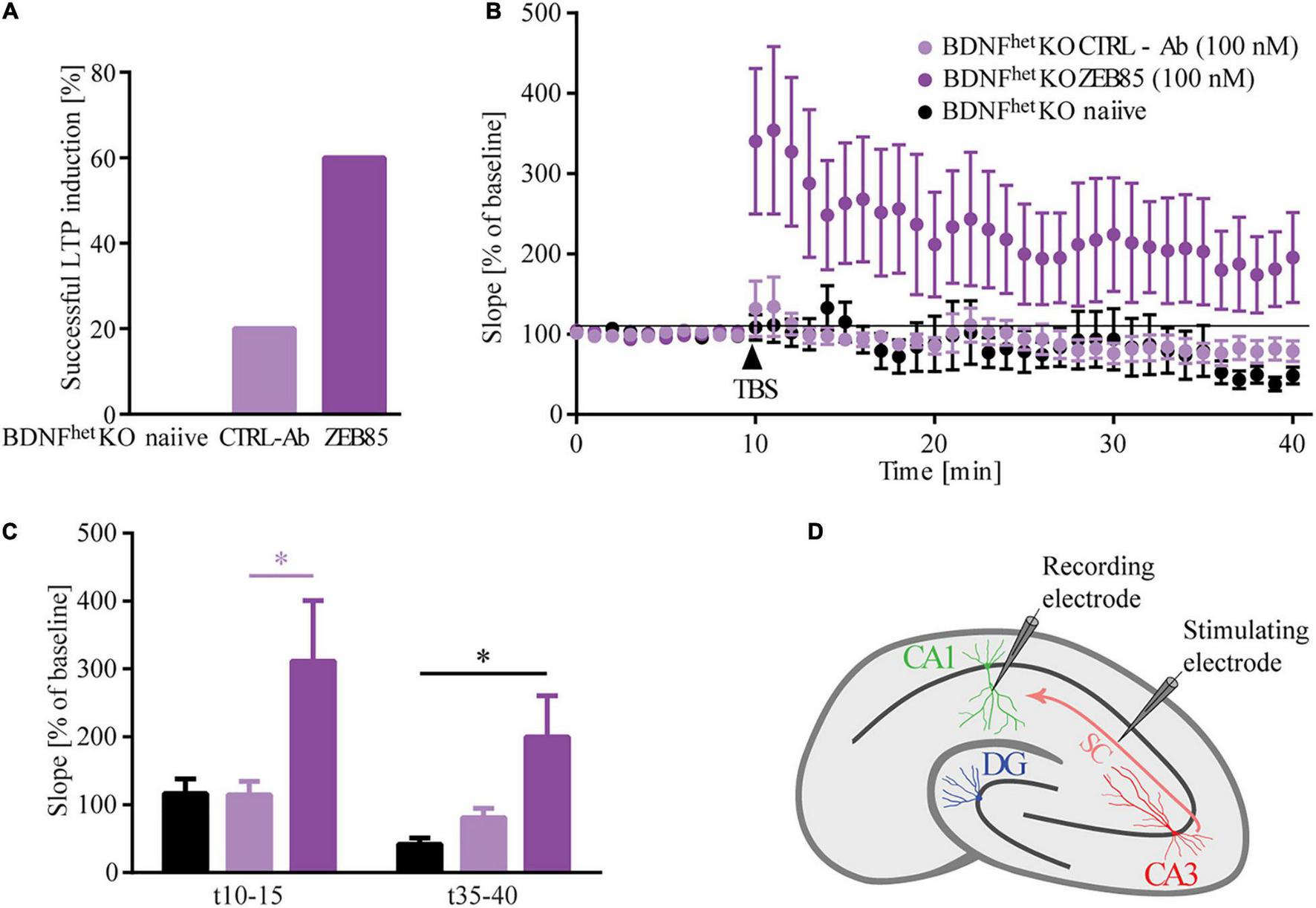 Figure 5. ZEB85 rescues LTP deficits in hippocampal slices of BDNF knockout mice. fEPSP were recorded at the CA3-CA1 pathway of DIV21/22 organotypic hippocampal slice cultures prepared from heterozygous BDNF-knockout mice treated for 5–6 days with 100 nM ZEB85 or CTRL-Ab or left untreated. (A) Graph shows the percentage of successful LTP inductions. The criterion for a successful LTP induction was based on the fact that fEPSPs for the last 5 min after TBS were larger than 120% of the baseline. (B) fEPSP recordings over time. Baseline was recorded for 10 min after which TBS was applied and LTP was measured for another 30 min. The data are presented as mean ± SEM and were tested using a repeated measure two-way ANOVA. (C) Graph shows the mean values of the first and last 5 min after LTP induction. The data are presented as mean ± SEM and were tested using a one-way ANOVA with Bonferroni post-test. (D) Schematic of the fEPSP recordings in a hippocampal slice with electrode placement in the CA3-CA1 pathway. (Naïve: N = 5 mice, n = 8 slices; CTRL-Ab and ZEB85: N = 6 mice, n = 10 slices). *p < 0.05.