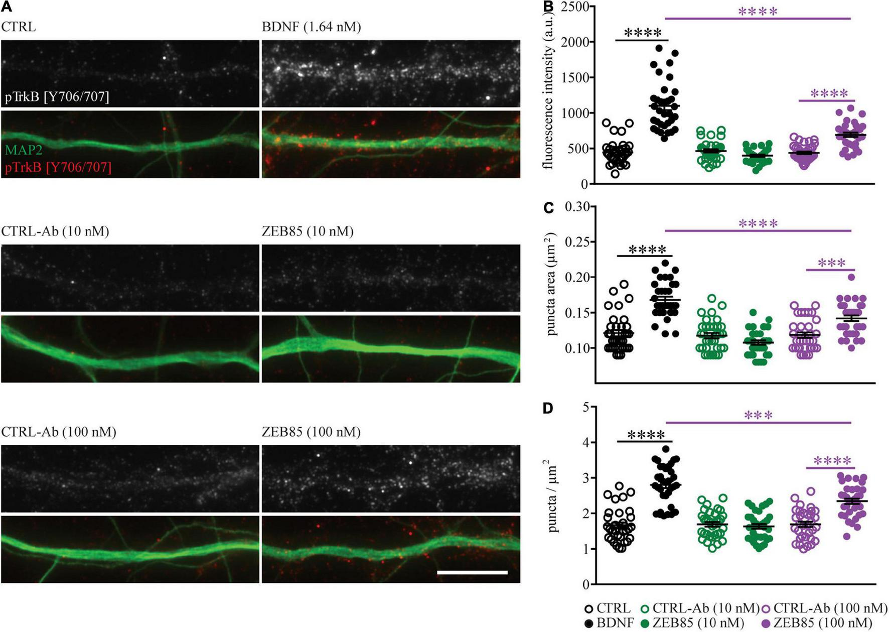 Figure 6. ZEB85 leads to TrkB phosphorylation. Primary hippocampal cultures DIV21 were treated for 15 min with ZEB85 (10 nM and 100 nM), BDNF (1.64 nM) and the corresponding controls. (A) Representative dendritic segments immunostained for MAP2 and the TrkB phosphorylation site Tyr706/707 (pTrkB) shown for the different treatment groups. Scale bar, 10 μm. (B) Quantification of pTrkB fluorescence intensity, (C) pTrkB puncta area, and (D) pTrkB density. (n = 33 dendrites/neurons; N = 3 independent experiments). The data are presented as mean ± SEM and were tested using a one-way ANOVA with Bonferroni post-test. ***p < 0.001; ****p < 0.0001.