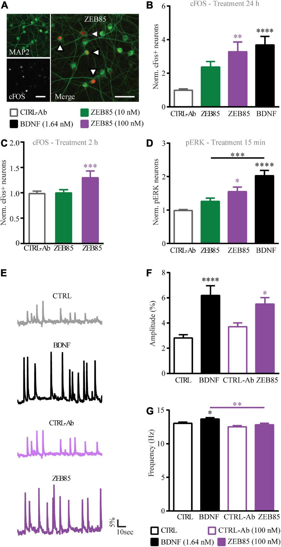 Figure 7. ZEB85 induces cFOS and pERK expression and promotes intracellular calcium dynamics. (A) Primary hippocampal cultures DIV21 were immunostained for MAP2 (left insert above) and cFos (left insert below) or pERK (not shown). The arrows in the merged image (right) indicate cFOS expressing MAP2 positive neurons. Scale bar, 50 μm. The number of cFOS/pERK positive neurons was calculated over total MAP2 positive neurons with a defined ROI, and is normalized to the controls (B–D). Quantification of cFOS positive neurons treated for panels (B) 24 h (CTRL-Ab: n = 19 coverslips; BDNF: n = 20; ZEB85 10 nM: n = 9; ZEB85 100 nM: n = 11 coverslips; for 10 nM N = 4 independent experiments and for 100 nM; N = 3 independent experiments) or (C) 2 h (CTRL-Ab: n = 46; ZEB85 10 nM: n = 23; ZEB85 100 nM: n = 24; N = 8 independent experiments) and quantification of panel (D) pERK positive neurons treated for 15 min (CTRL-Ab and BDNF: n = 15; ZEB85 10 nM: n = 8; ZEB85 100 nM: n = 6; N = 3 independent experiments). Neurons were treated with ZEB85 (10 nM and 100 nM) and control-antibody (CTRL-Ab) and for panels (B,D) additionally with BDNF. (E) Ca2+-imaging traces of OGB loaded neurons after a 24 h treatment with BDNF, 100 nM ZEB85 and the respective controls. The percentage change in fluorescence intensity over time is illustrated. Scale bars are 5% vertical and 10 sec horizontal. (F) Ca2+ transient amplitude and (G) frequency of the different treatment groups. (CTRL: n = 97 neurons; BDNF: n = 95; CTRL-Ab n = 78; ZEB85: n = 85; N = 3 independent experiments). The data are presented as mean ± SEM and were tested using a one-way ANOVA with Bonferroni post-test. *p < 0.05; **p < 0.01; ***p < 0.001; ****p < 0.0001.