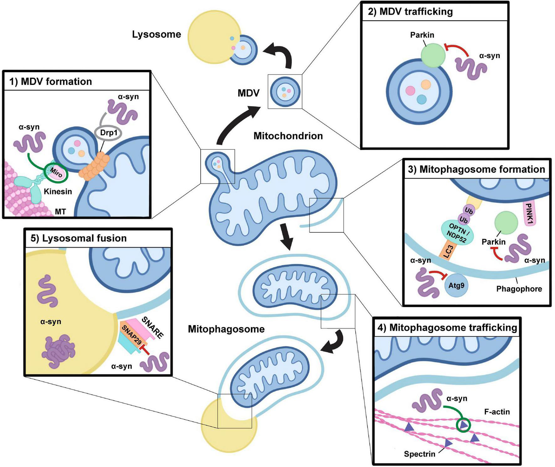 Figure 2. Alterations in alpha-synuclein function may impact mitochondrial quality control pathways. Alpha-synuclein function and its aggregation may have an impact at multiple levels during both mitophagy and the mitochondrial-derived vesicle pathway. (1) MDV formation: Drp1 and Miro proteins are required for mitochondrial-derived vesicle (MDV) fission from the mitochondrion in response to local oxidative damage, which may be directly influenced by alterations in alpha-synuclein (α-syn) function. Alpha-synuclein oligomers can stabilize Miro on the mitochondrial membrane and modulate Drp1 localization, although the precise impact of alpha-synuclein-induced alterations in Drp1 function is still a point of contention (indicated in gray). (2) MDV trafficking: Oligomeric species of alpha-synuclein may downregulate Parkin expression and alter its localization, which could have negative impacts on MDV formation and trafficking to the lysosome. (3) Mitophagosome formation: Mitophagy requires the action of PINK1 and Parkin to trigger the ubiquitylation of outer membrane proteins which leads to the recruitment of autophagy receptors, including NDP52 and OPTN, which facilitate the capture of damaged mitochondria within a phagophore, which matures into a mitophagosome. Alpha-synuclein may impact this process through alterations in Parkin activity and by inhibiting the recruitment of Atg9-positive vesicles which are required for autophagosomal membrane expansion. (4) Mitophagosome trafficking: Through interactions with spectrin, overexpression and accumulation of alpha-synuclein oligomers alters actin cytoskeletal dynamics resulting in its aberrant stabilization, which may negatively impact the maturation and trafficking of mitophagosomes required for endosomal and lysosomal fusion. (5) Lysosomal fusion: To enable cargo degradation, the mitophagosome requires the action of SNARE protein complexes to facilitate lysosomal fusion. Pathogenic overexpression of alpha-synuclein may alter SNAP29 activity, thus influencing the ability of mitophagosomes to fuse with lysosomes. In addition, accumulation of monomeric and oligomeric species of alpha-synuclein within lysosomes alters their activity, which may result in negative impacts on cargo degradation in both the mitophagy and MDV pathways.