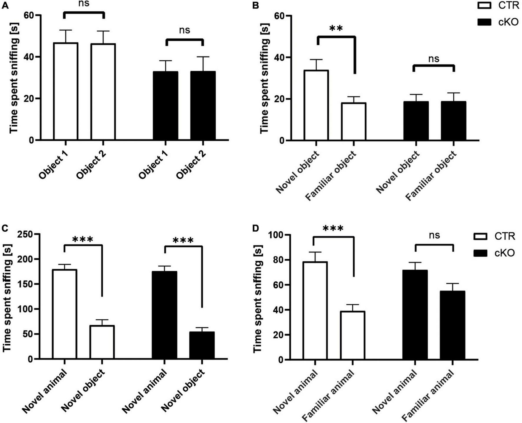 Normal social approach, but reduced social and object recognition in juvenile cKO mice. Graphs showing (A) time spent sniffing two identical objects (s), CTR: object 1: 46.9 ± 5.9, object 2: 46.4 ± 5.9, t31 = 0.135, p = 0.893, n = 32; cKO: object 1: 33.0 ± 5.1, object 2: 33.1 ± 6.9, t35 = 0.018, p = 0.986, n = 36. (B) Time spent sniffing novel and familiar object (s), CTR: novel: 34.0 ± 5.0, familiar: 18.3 ± 2.8, t31 = 3.226, p < 0.01; cKO: novel: 18.8 ± 3.3, familiar: 18.9 ± 5.3, t35 = 0.008, p = 0.994. (C) Time spent sniffing social and non-social stimulus (s), CTR: social: 179.7 ± 12.2, non-social: 67.6 ± 11.1, t37 = 5.854, p < 0.001; cKO: social: 175.7 ± 15.7, non-social: 54.8 ± 8.2, t37 = 6.673, p < 0.001. (D) Time spent sniffing novel and familiar social stimulus (s), CTR: novel: 78.7 ± 8.6, familiar: 39.1 ± 5.1, t37 = 3.983, p < 0.001; cKO: novel: 72.0 ± 8.1, familiar: 55.1 ± 8.1, t37 = 1.280, p = 0.209. ns: p = 0.05, **p < 0.01, ***p < 0.001.