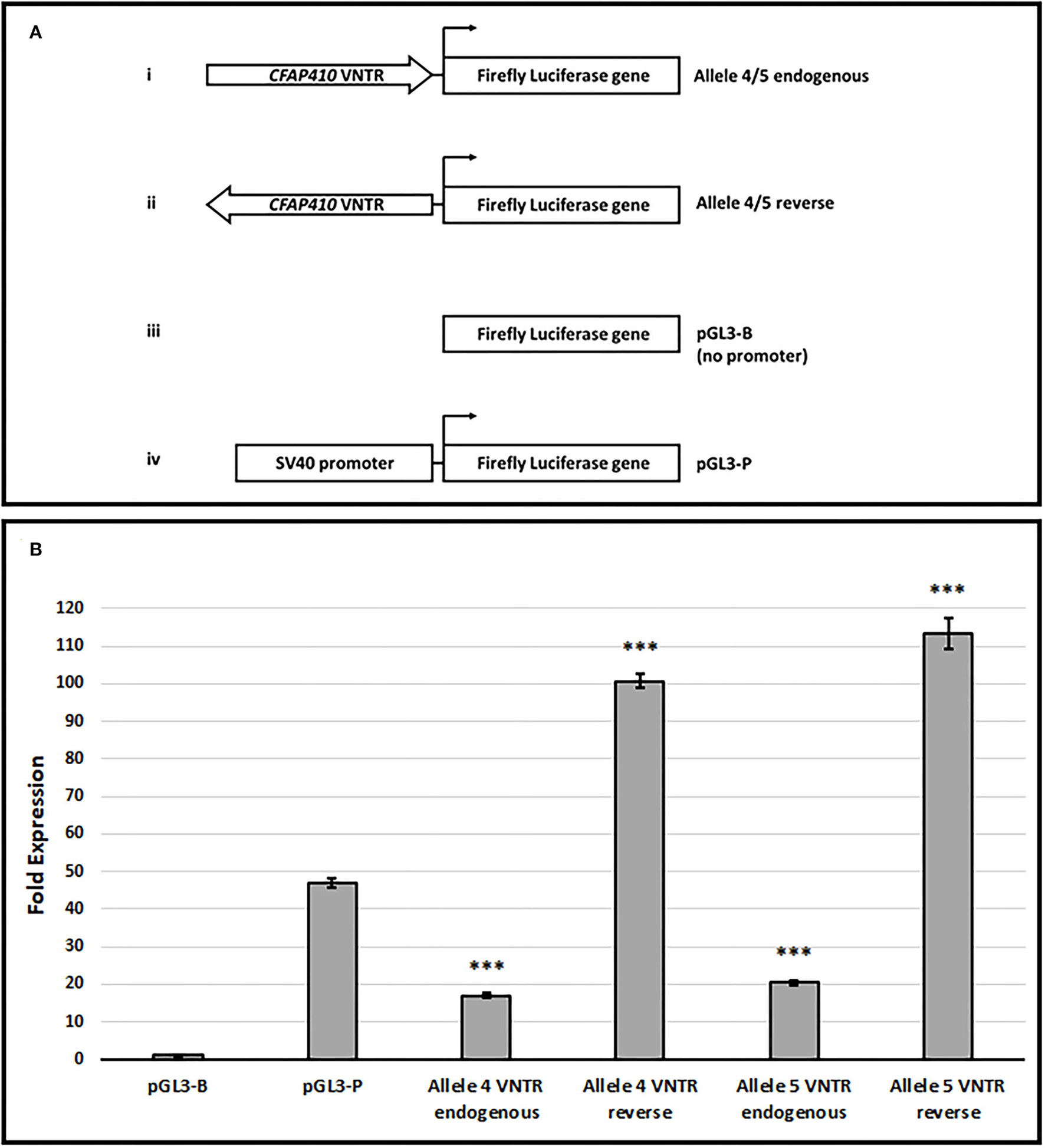 The CFAP410 VNTR shows functional properties in the pGL3-P vector in the HEK293 cell line. (A) Schematic for VNTR containing constructs and pGL3 vectors (Promega) used in the luciferase assay. (B) The fold activity of alleles 4 and 5 of the CFAP410 VNTR in the endogenous (forward) orientation within the pGL3P vector, normalised to the internal control Renilla luciferase (Biological replicate n = 3, technical replicate per assay n = 4). The promoter-less vector (pGL3-B) was included as a negative control. T-test was used to compare VNTR-containing constructs to SV40 unmodified vector (pGL3-P) and to compare all VNTR containing constructs against each other. ***P = <0.001.