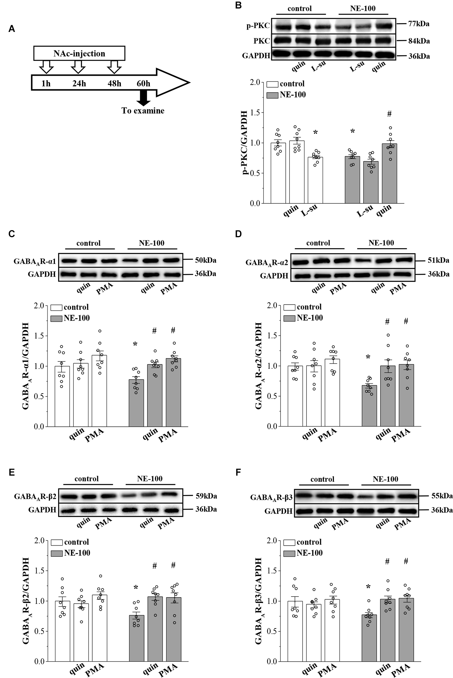 Repeated injection of NE-100 reduces PKC signaling leading to decreased GABAAR expression. (A) Time chart of the experimental procedure. (B) Representative blots of phospho-PKC in the NAc of control mice treated with quinpirole (quin) or L-sulpiride (L-su), and NE-100 mice treated with L-sulpiride (L-su) or quinpirole (quin). Densitometric values of phospho-PKC normalized by the PKC protein were normalized by control levels. *p < 0.05 vs. control mice; #p < 0.05 vs. NE-100 mice (n = 8 mice per group; two-way ANOVA). (C–F) Bar graphs show levels of GABAAR-α1, GABAAR-α2, GABAAR-β2, and GABAAR-β3 protein in the NAc of control mice and NE-100 mice treated with NAc-injection of quinpirole (quin) or PMA. Densitometric values normalized by the level of GAPDH were normalized by control levels. *p < 0.05 vs. control mice; #p < 0.05 vs. vehicle-treated NE-100 mice (n = 8 mice per group; two-way ANOVA).