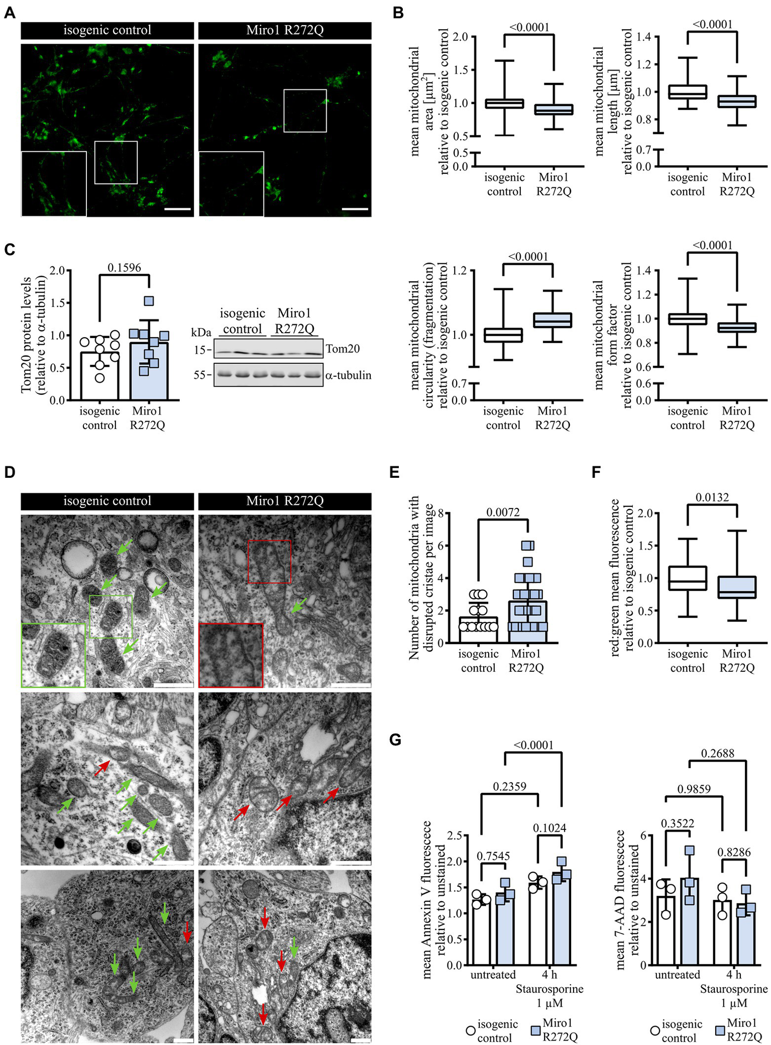 Miro1 R272Q alters mitochondrial morphology concomitant with changes in cristae organization. (A) Representative image of hDaNs stained with 100 nM MitoTracker green to label mitochondria for analysis of mitochondrial morphology. Scale bar: 50 μM. (B) Analysis of mitochondrial morphology of hDaNs stained with 100 nM MitoTracker green to assess mitochondrial area, length, fragmentation, and form factor. Values of one differentiation normalized to mean of isogenic control of the same differentiation. nDiff = 3 (20 images per differentiation), data displayed as mean ± SD; Mann–Whitney test. (C) Tom20 protein levels in hDaN lysates. Representative blot and quantification of intensity of Tom20 bands relative to a-tubulin. nDiff = 8, data displayed as mean ± SD; paired t test (two-tailed). (D) Representative electron microscopy of hDaNs. Red arrows indicate mitochondria with regions devoid of cristae, green arrows indicate mitochondria with maintained cristae. Scale bar: 500 nm. (E) Blinded quantification of mitochondria with disrupted cristae structure per EM image. nDiff = 3, data displayed as mean ± SD; Welch’s t test (two-tailed). (F) Assessment of mitochondrial renewal in hDaNs by transfection with pMitoTimer. Quantification of mean red:green fluorescence and normalization of values of one differentiation to mean of isogenic control of the same differentiation. nDiff = 3 (nimages = 42), data displayed as mean ± SD; Mann–Whitney test. (G) Flow cytometric assessment of susceptibility to apoptosis. hDaNs treated for 4 h with 1 μM Staurosporine were stained with apoptotic marker Annexin V and necrotic marker 7-AAD. Mean fluorescence of each channel normalized to unstained signal. nDiff = 3, data displayed as mean ± SD; Two-way ANOVA with Tukey’s multiple comparisons.