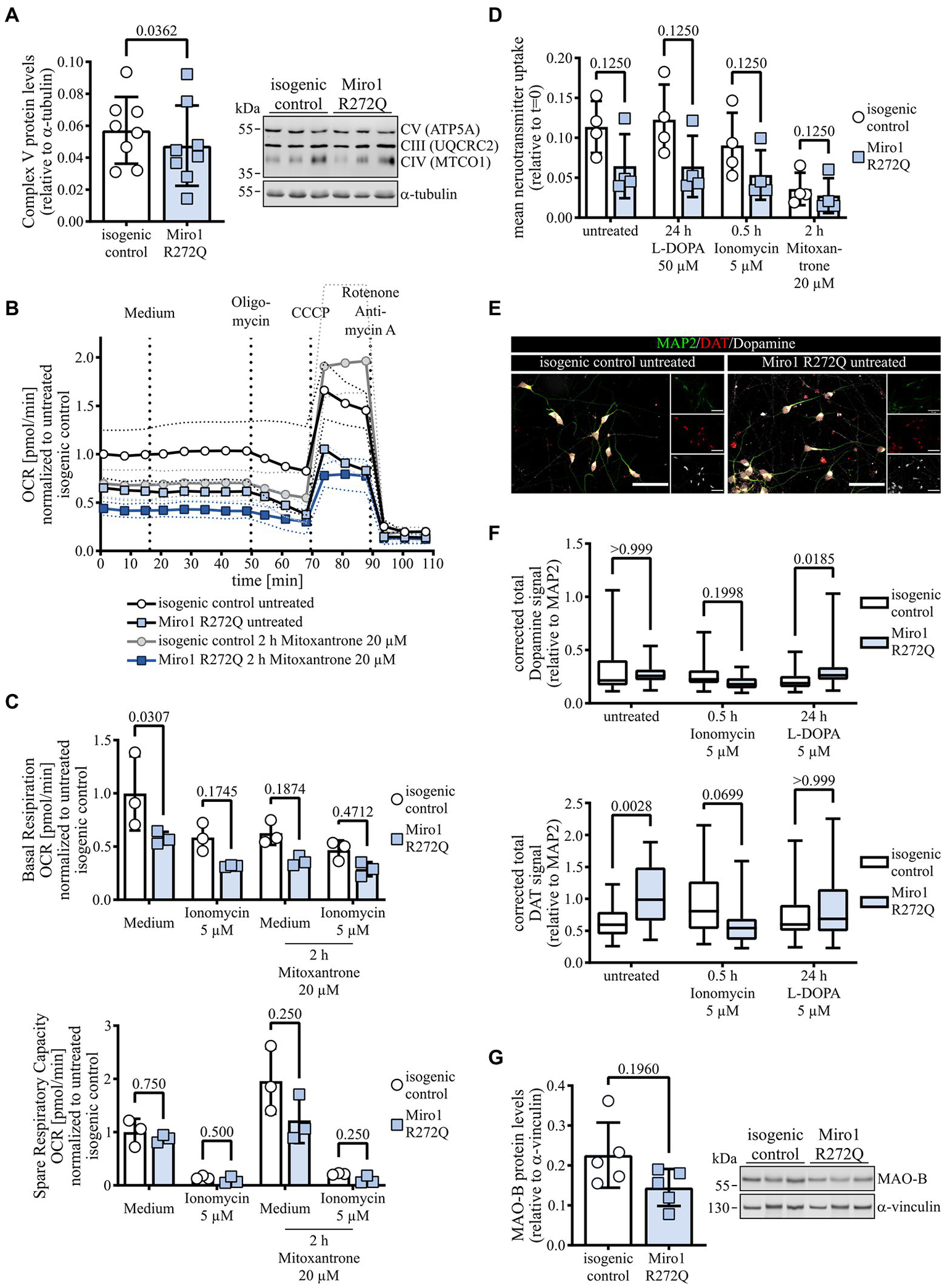 To test the functional consequences of both the altered mitochondrial structure and calcium handling observed in Miro1 R272Q hDaNs, we first assessed mitochondrial respiration. We tested levels of OXPHOS complexes and found a significant reduction of Complex V (Figure 4A), while Complexes IV and III were unaffected (Supplementary Figure 1F). Analyzing mitochondrial membrane potential using indicator TMRM, we found that the reduction in Complex V in Miro1 R272Q hDaNs does not affect mitochondrial membrane potential (Supplementary Figure 1G). We next measured mitochondrial respiration in a modified stress test; hDaNs were challenged with Oligomycin to inhibit Complex V, CCCP to depolarize mitochondria and Rotenone with Antimycin A to inhibit Complexes I and III, respectively. To link mitochondrial respiration to mitochondrial calcium, uptake was blocked with 20 μM Mitoxantrone for 2 h and prior to injection of Oligomycin hDaNs were first challenged with 5 μM Ionomycin to deplete mitochondrial calcium with medium as control. Miro1 R272Q hDaNs show an overall reduction of mitochondrial oxygen consumption (Figure 4B), but no compensatory increase in glycolysis indicated by extracellular acidification rate (Supplementary Figure 1H). Our data indicate that this is due to an impaired mitochondrial calcium uptake because depletion of mitochondrial calcium by either ionomycin or Mitoxantrone decreases respiration in isogenic control hDaNs to approximately 58% (Two-way ANOVA, Tukey’s multiple comparisons p = 0.0316) and 62% (Two-way ANOVA, Tukey’s multiple comparisons p = 0.0482), respectively (Figure 4C); basal respiration of Miro1 R272Q is reduced to approximately 58%. Miro1 R272Q does respond to both ionomycin and Mitoxantrone treatment, to approximately 32% (Two-way ANOVA, Tukey’s multiple comparisons p = 0.1687) and 37% (Two-way ANOVA, Tukey’s multiple comparisons p = 0.2818) of untreated isogenic control, respectively (Figure 4C), but could be due to the heterozygosity of the mutation. Assessing spare respiratory capacity (ability of mitochondria to meet energetic demand), we found no differences between Miro1 R272Q and isogenic control at baseline (Figure 4C). Treatment with Mitoxantrone however increases spare respiratory capacity in isogenic control hDaNs by a factor of approximately 2 (Friedman test with Dunn’s multiple comparisonsp > 0.9999), while the increase in Miro1 R272Q is only approximately 1.4-fold (Friedman test with Dunn’s multiple comparisons p > 0.9999, Figure 4C). Taken together, these results support our hypothesis that Miro1 R272Q impairs mitochondrial calcium handling which in turn decreases mitochondrial respiration.