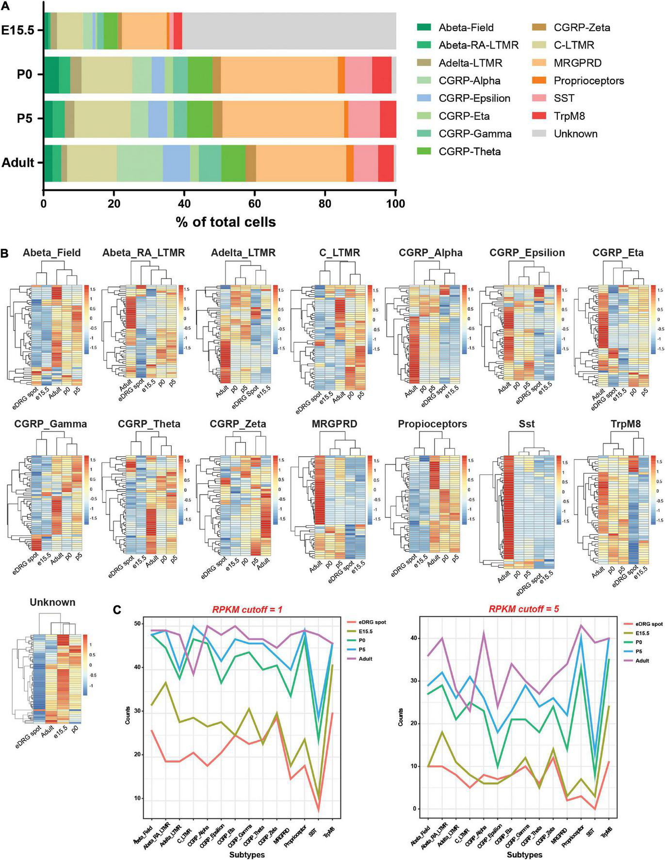 Figure 2. Neurons in the eDRG at DIV7 are similar to DRG neurons at the E15.5 developmental stage. (A) Fraction of 15 neuronal subtypes across four developmental stages of DRG neurons. (B) Heatmap shows the scaled z-score of the average CPM of 50 subtype-specific genes from eDRG controls and 4 developmental stages. Both row and column clustering were applied. High and low expressions are indicated in red and blue, respectively. (C) Plots of the counts of 50 subtype-specific genes expressed in each neuronal subtype during development using RPKM with cutoffs of 1 and 5.