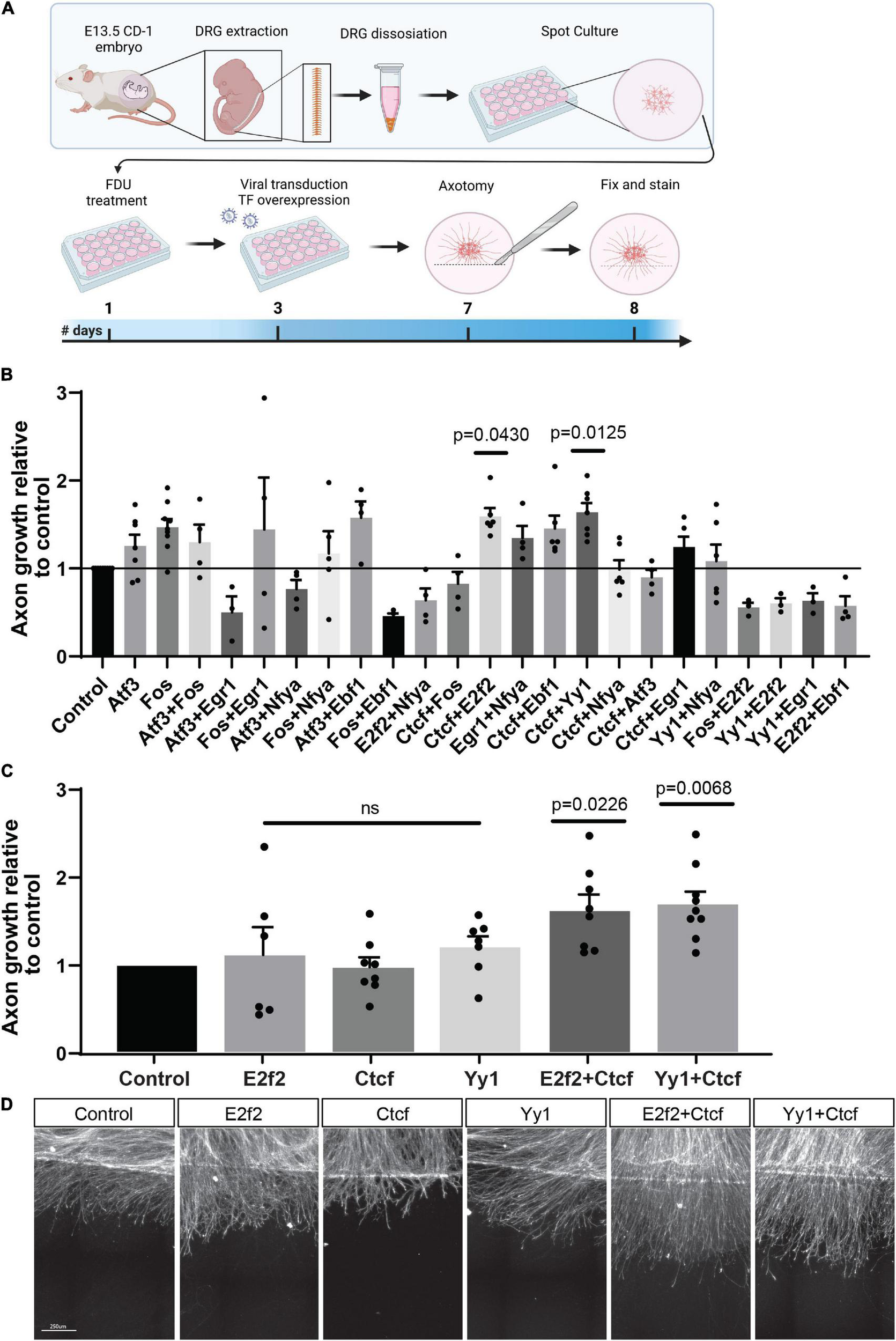 Because it is likely that a single TF is not sufficient to fully restore neuron-intrinsic axon growth potential, and that a combination of TFs is needed (Venkatesh and Blackmore, 2017), we decided to overexpress combinations of TFs identified in our analysis, and test if a given TF combination can promote regeneration. We used the eDRG spot culture model to screen the effect of lentiviral mediated expression of TFs combinations on regenerative axon growth 24 h after in vitro axotomy, as described previously (Cho et al., 2013, 2015; Avraham et al., 2020). We selected 8 TFs that were predicted to regulate DEG after injury in our analysis and were also identified in different in vivo regeneration models but have not been directly tested for their pro-regenerative potential. These are Atf3 (Tsujino et al., 2000; Chandran et al., 2016; Renthal et al., 2020), Fos (Stam et al., 2007; Michaelevski et al., 2010), Egr1 (Zou et al., 2009; Michaelevski et al., 2010), Nfya (Smith et al., 2011), Ebf1 (Smith et al., 2011), E2f2 (Pita-Thomas et al., 2021), Ctcf (Palmisano et al., 2019; Pita-Thomas et al., 2021), Yy1 (Stam et al., 2007). Interestingly, CTCF is also known as a chromatin remodeler and conditional deletion of CTCF in vivo impairs nerve regeneration, implicating chromatin organization in the regenerative competence (Palmisano et al., 2019). Whether CTCF expression is sufficient to enhance axon regeneration had not been tested.