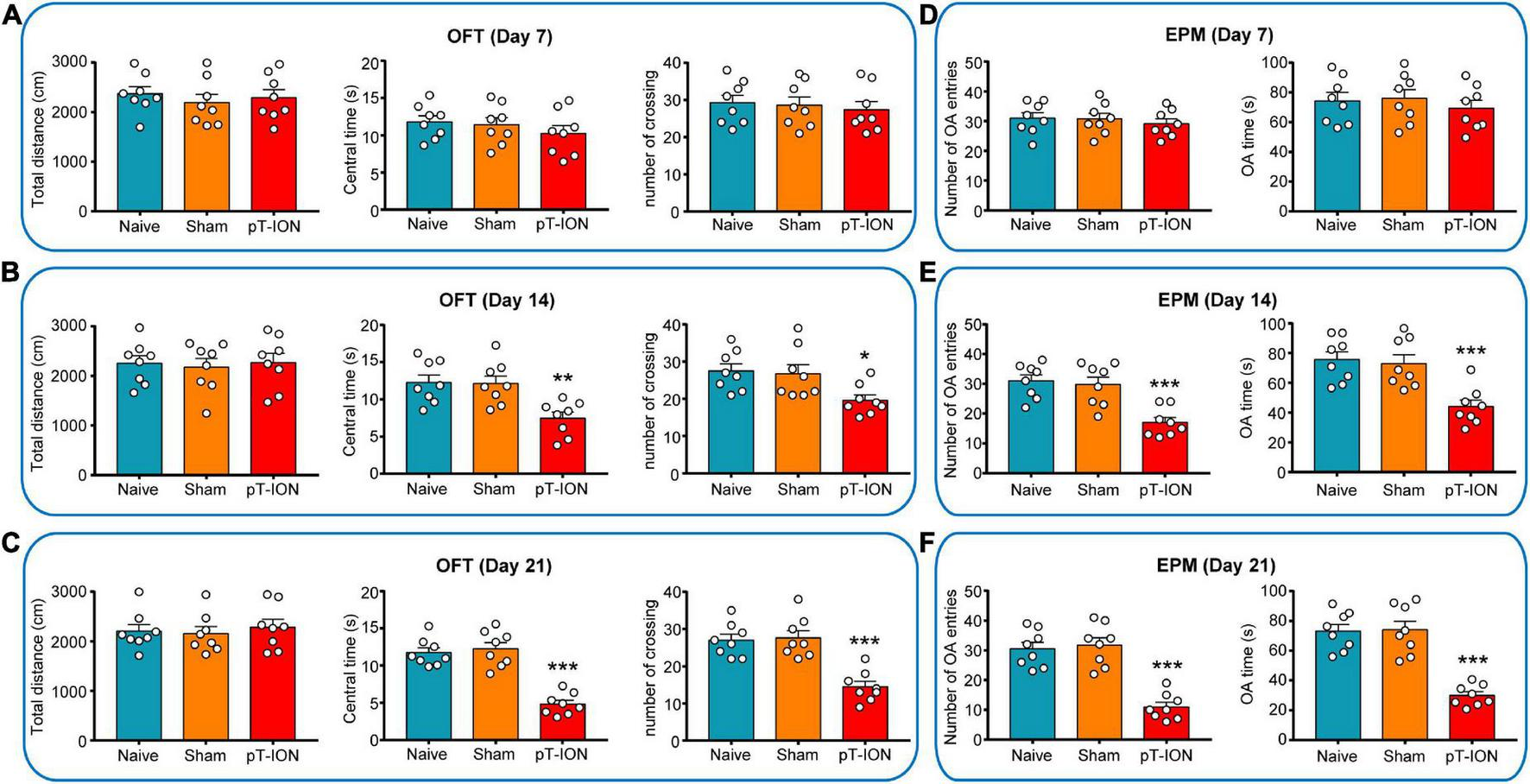 Open-field test (OFT) and elevated plus-maze (EPM) test results of mouse at various time points. In the OFT, the total distance, central time, and number of crossing were measured on days 7 (A), 14 (B), and 21 (C) after pT-ION surgery. In the EPM test, the number of entries in the open arms (number of OA entries), time spent in the open arms (OA time) were measured on days 7 (D), 14 (E), and 21 (F) after pT-ION surgery. N = 8 mice/group, *P < 0.05, **P < 0.01, and ***P < 0.001 vs. naive group, one-way ANOVA and Dunnett’s test.