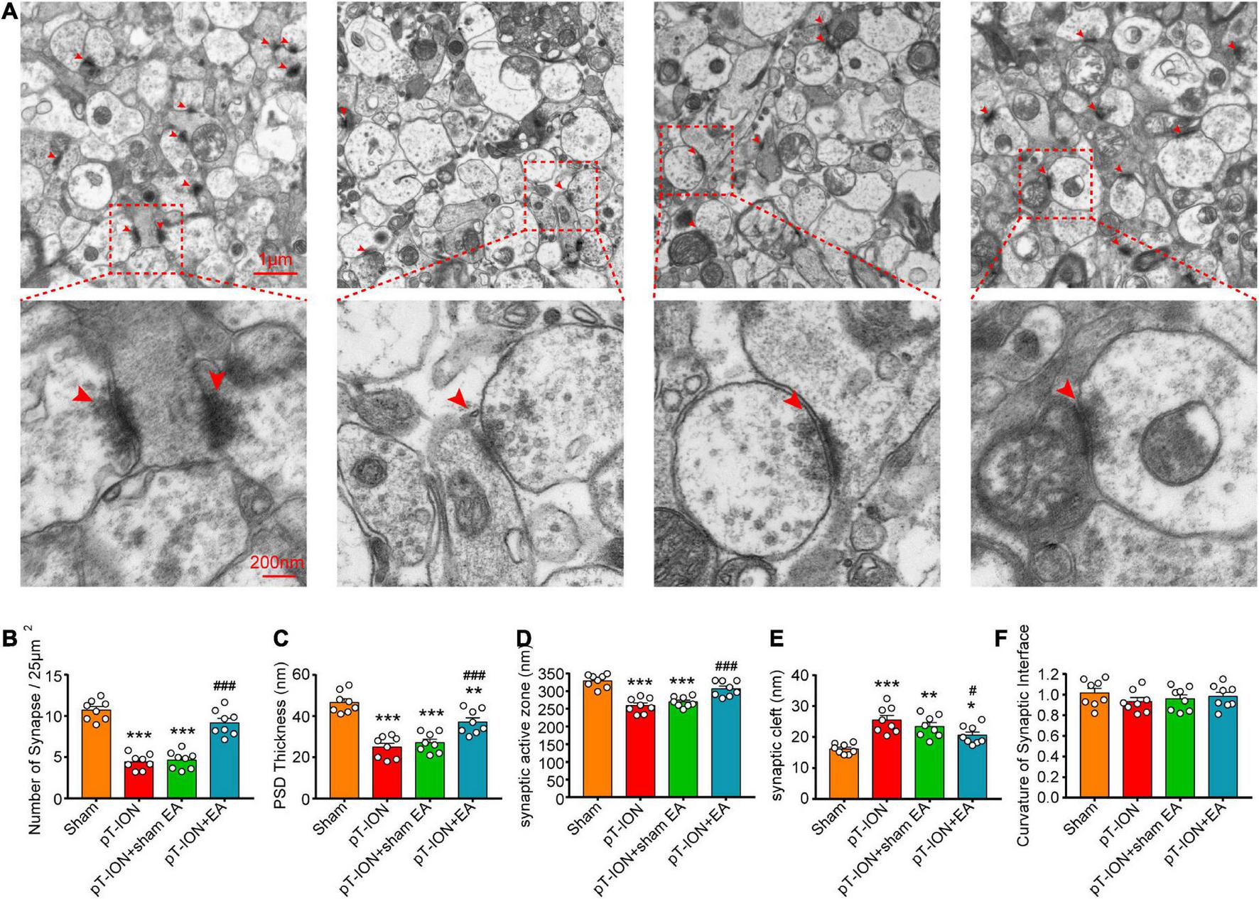 Protective electroacupuncture (EA) effects on density and ultrastructure of synapses in the CA1 hippocampal region of pT-ION mice. (A) Representative transmission electron microscopy (TEM) images showing the density and ultrastructure of synapses of the CA1 region in each group. The bar graphs show the number of synapses/25°μm2(B), the thickness of the postsynaptic densities (PSD) (C), the length of the synaptic active zone (D), the width of the synaptic cleft (E), and the curvature of the synaptic interface (F) in each group. N = 8 mice/group, *P < 0.05, **P < 0.01, and ***P < 0.001 vs. sham group; #P < 0.05 and ###P < 0.01 vs. pT-ION group, one-way ANOVA and Tukey’s test.