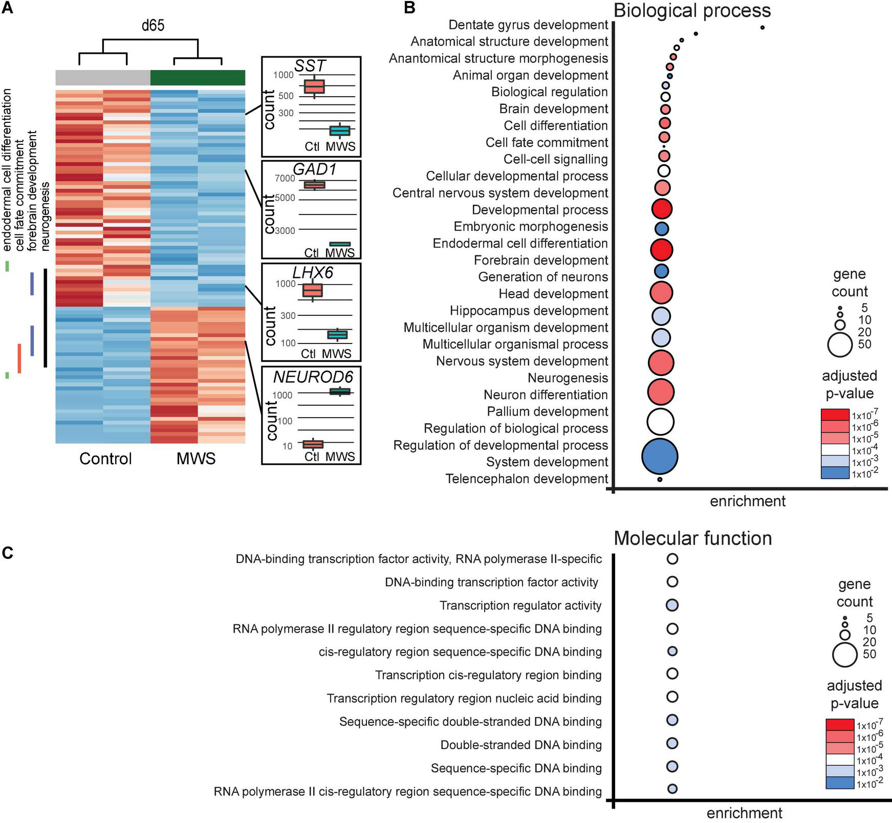 (A) Hierarchial clustering (z-scores) of 93 differentially expressed genes in two Ctl-iPSC GABA and two MW-iPSC GABA lines at d65 of differentiation from RNAseq. The expression (normalized counts) of selected genes (SST, GAD1, LHX6, NEUROD6) of importance for interneuronal development is highlighted as bar and whisker plots in Ctl-iPSC GABA (n = 2) and MW-iPSC GABA (n = 2). (B,C) GO enrichment analysis of 93 DEGs at d65 in MW-iPSC GABA cells showing the top 28 list of biological processes (B) and top 11 molecular functions (C). Categories are listed according to adjusted p-values and number of DEGs in each category (gene count; Supplementary Tables 2A,C).