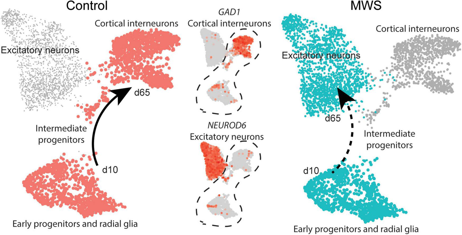 MW-iPSC with ZEB2 haploinsufficiency exhibit an aberrant interneuronal differentiation trajectory. The expression levels of GAD1 and NEUROD6 in Ctl-iPSC GABA (n = 2) and MW-iPSC GABA from RNAseq were inferred on pseudo-time trajectories of human cortex development. The expression of both genes in Ctl-iPSC GABA (left) are consistent with expression following the expected trajectory of cortical interneurons (Control, cell types highlighted in red). In MW-iPSC derived neural cells (MWS), the GAD1 and NEUROD6 expression suggests an early trajectory reminiscent of that for excitatory neuronal subtypes (dashed arrow).