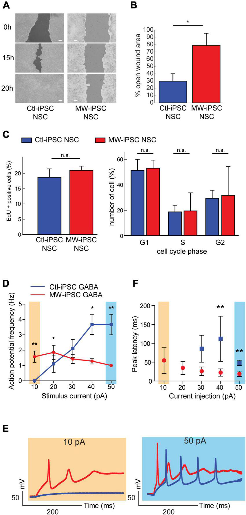 MW-iPSC derived neural cells with ZEB2 haploinsufficiency show impaired migration and altered electrophysiology. (A,B) Assessment of cell motility of iPSC-NSCs at day 10 using a wound healing scratch assay shows impaired motility in MW-iPSC NSCs. (A) Confluent cultures of MW-iPSC NSCs and Ctl-iPSC NSCs at day 10 were scratched and imaged at identical positions after 0 h, 15 h and 20 h. Representative pictures are shown. Size bar 200 μm. (B) Quantification of open wound area in MW-iPSC NSCs and Ctl-iPSC NSCs using TScratch software. The remaining open area was quantified at 15 h vs. 0 h (3 replicates per iPSC line) and significantly larger in MW-iPSC NSCs when compared to Ctl-iPSC NSCs (*p < 0.05). (C) Assessment of Proliferation of iPSC-NSC at day 10 using EdU proliferation assay and cell cycle analysis show similar proliferation activity of patient and control iPSC derived cells (n.s., not significant; n = 4 replicates per cell line). (D–F) MW-iPSC GABA cells show aberrant firing of action potentials and shorter peak latency time in response to step current injections. (D) The maximal frequency of evoked action potentials (eAPs) was markedly reduced in MW-iPSC GABA cells (red line) as compared to control cells (blue line; eAPs (Hz) plotted versus the stimulus current (pA) used). (E) Responses to 10 pA (yellow) (left panel) and 50 pA (blue) (right panel) current injections lasting 500 ms in representative MW-iPSC GABA and Ctl-iPSC GABA cells at a holding potential of –60 mV. At a depolarizing current stimulus of 10 pA the MW-iPSC GABA cells were able to fire single eAPs while Ctl-iPSC GABA cells remained silent. At a depolarizing current stimulus of 50 pA, MW-iPSC GABA cells fired still only single eAPs while Ctl-iPSC GABA cells fired multiple consecutive eAPs. (F) The peak latency (delay time; ms) of iPSC-GABA cells in response to the injected stimulus (pA) was significantly reduced in MW-iPSC GABA cells at current injections >30 pA. **p < 0.005, *p < 0.05.