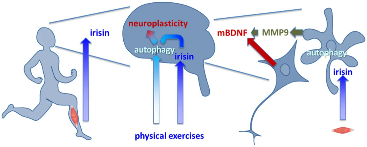 Physical activity results in irisin release. Irisin facilitates autophagy in the brain acting via glia activation. Autophagy activation favors maturation of BDNF and neuroplasticity.