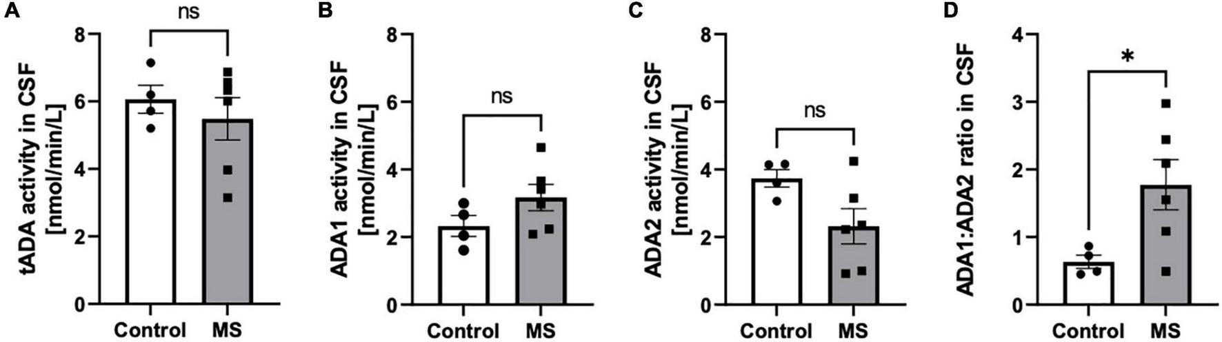 The ratio of soluble adenosine deaminase ADA1 to ADA2 activity was increased in the CSF of MS patients compared to healthy subjects. Cerebrospinal fluid (CSF) total soluble adenosine deaminase (tADA) (A), ADA1 (B) and ADA2 (C) activities and ADA1 to ADA2 ratio (D) in patients with multiple sclerosis (n = 5) and healthy controls (n = 4). Results are shown as mean ± SEM; *p < 0.05 by Student t-test (D); ns, not significant.