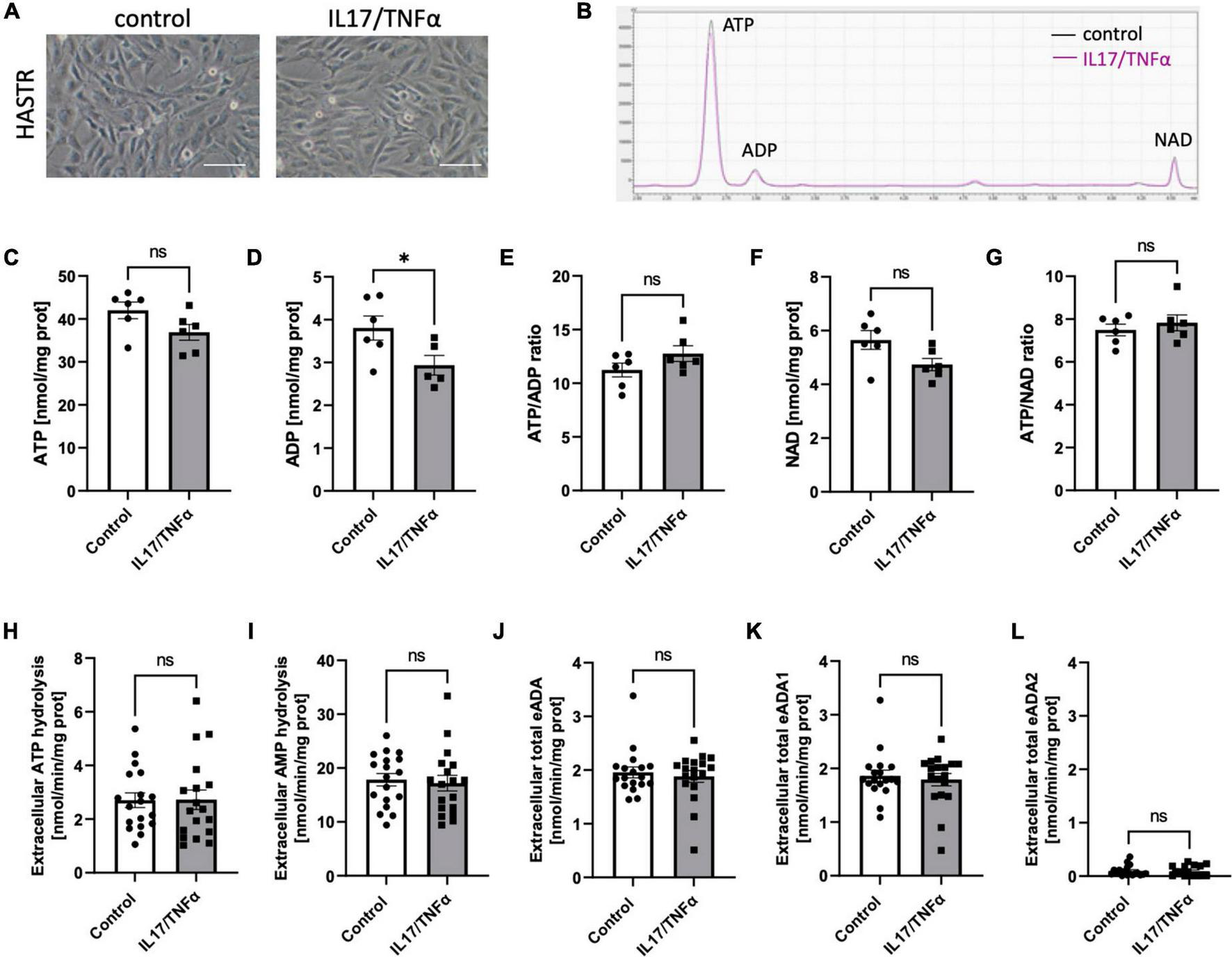Treatment of HASTR with IL17 and TNFα did not affect cell-surface ecto-adenosine deaminase (eADA) activity. Representative images of human astrocytes treated for 18 h with 50 ng/ml IL17 and 10 ng/ml TNFα, scale bar = 50 μm (A). Representative chromatogram with signals for adenosine triphosphate (ATP), adenosine diphosphate (ADP), and nicotinamide adenine dinucleotide (NAD) in control (black) and IL17/TNFα-treated (pink) astrocytes (B). Intracellular ATP (C) and ADP (D) concentration and ATP/ADP ratio (E), NAD (F) concentration and ATP/NAD ratio (G) in IL17/TNFα-treated astrocytes. The rate of cell-surface ATP (H) and AMP (I) hydrolysis and the activity of cell-surface total eADA (J), eADA1 (K) and eADA2 (L) in IL17/TNFα-treated astrocytes (C). Results are shown as mean ± SEM; N = 3 independent experiments; n = 2 (C–G), n = 6 (H–L) biological replicates per experiment; *p < 0.05 by Student t-test; ns, not significant.