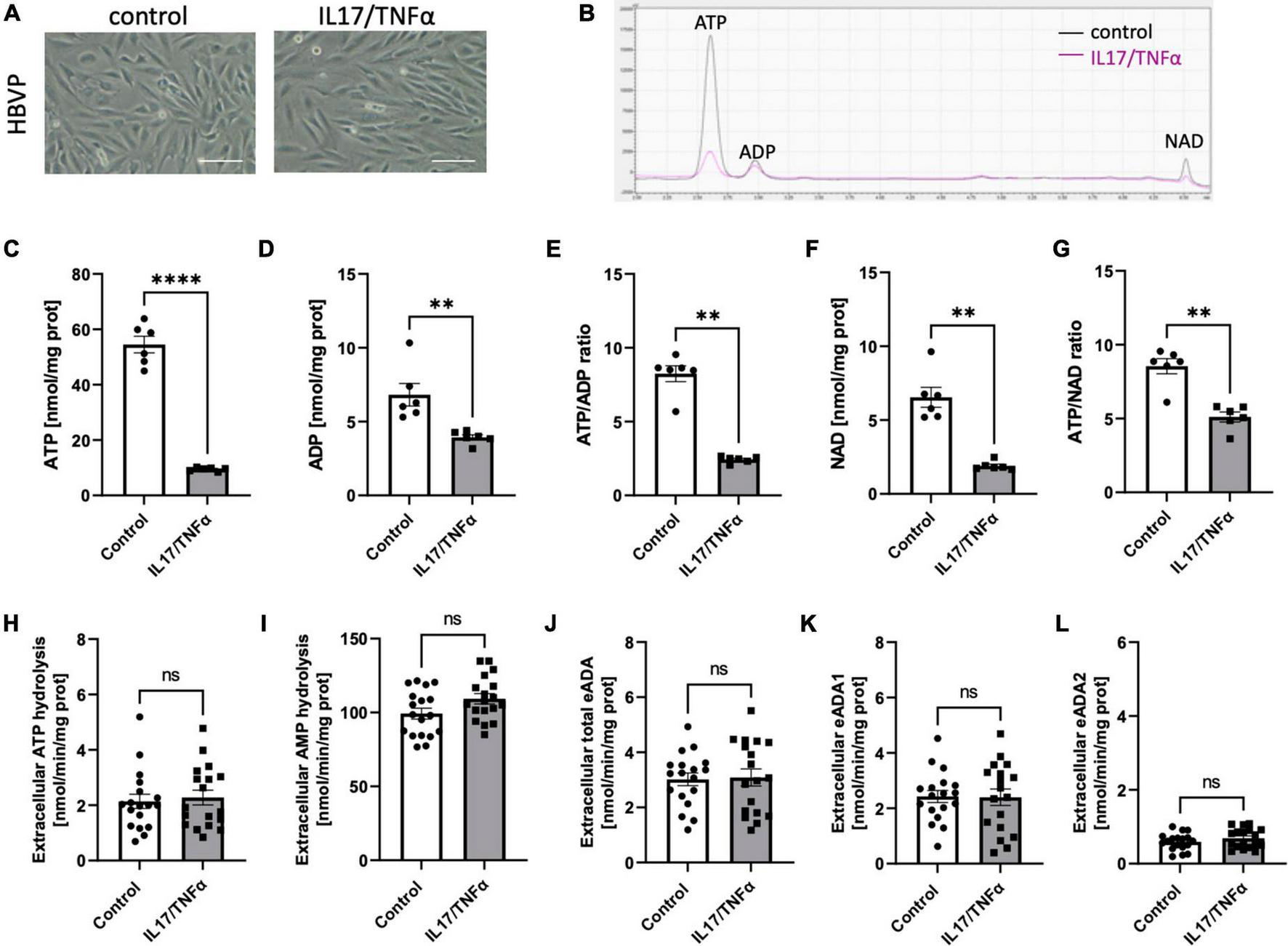 Treatment of HBVP with IL17 and TNFα did not affect cell-surface ecto-adenosine deaminase (eADA) activity. Representative images of human brain vascular pericytes treated for 18 h with 50 ng/ml IL17 and 10 ng/ml TNFα, scale bar = 50 μm (A). Representative chromatogram with signals for adenosine triphosphate (ATP), adenosine diphosphate (ADP), and nicotinamide adenine dinucleotide (NAD) in control (black) and IL17/TNFα-treated (pink) pericytes (B). Intracellular ATP (C) and ADP (D) concentration and ATP/ADP ratio (E), NAD (F) concentration and ATP/NAD ratio (G) in IL17/TNFα-treated pericytes. The rate of cell-surface ATP (H) and AMP (I) hydrolysis and the activity of cell-surface total eADA (J), eADA1 (K) and eADA2 (L) in IL17/TNFα-treated pericytes. Results are shown as mean ± SEM; N = 3 independent experiments; n = 2 (C–G), n = 6 (H–L) biological replicates per experiment; **p < 0.01; ****p < 0.0001 by Student t-test (C,D) and Mann-Whitney U-test (E–G) ns, not significant.