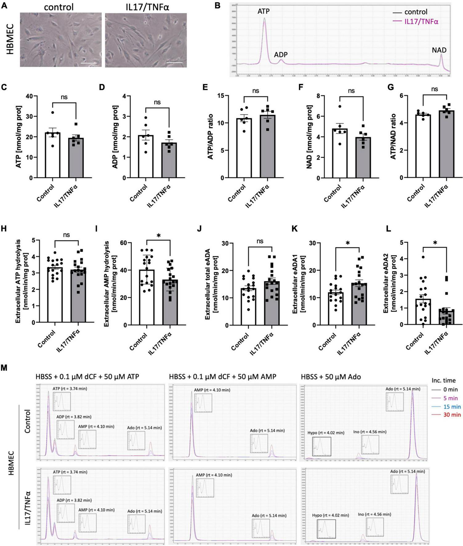 Treatment of HBMEC cells with IL17 and TNFα induced eADA1 and decreased eADA2 activities. Representative images of human brain microvascular endothelial cells (HBMEC) treated for 18 h with 50 ng/ml IL17 and 10 ng/ml TNFα, scale bar = 50 μm (A). Representative chromatogram with signals for adenosine triphosphate (ATP), adenosine diphosphate (ADP), and nicotinamide adenine dinucleotide (NAD) in control (black) and IL17/TNFα-treated (pink) HBMEC (B). Intracellular ATP (C) and ADP (D) concentration, ATP/ADP ratio (E), NAD concentration (F) and ATP/NAD ratio (G) in IL17/TNFα-treated HBMEC. The rate of cell-surface ATP (H) and AMP (I) hydrolysis, the activity of cell-surface total ecto-adenosine deaminase (eADA) (J), eADA1 (K) and eADA2 (L) in IL17/TNFα-treated HBMEC. Representative chromatograms with signals for the determination of ATP hydrolysis, AMP hydrolysis and total adenosine deamination in control and IL17/TNFα-treated HBMEC (M). Results are shown as mean ± SEM; N = 3 independent experiments; n = 2 (C–G), n = 6 (H–L) biological replicates per experiment; *p < 0.05 by Student t-test (H,J) or Mann-Whitney U-test (K). ns, not significant; Inc. time, incubation time; AMP, adenosine monophosphate; Ado, adenosine; Ino, inosine; Hypo, hypoxanthine; rt, retention time.