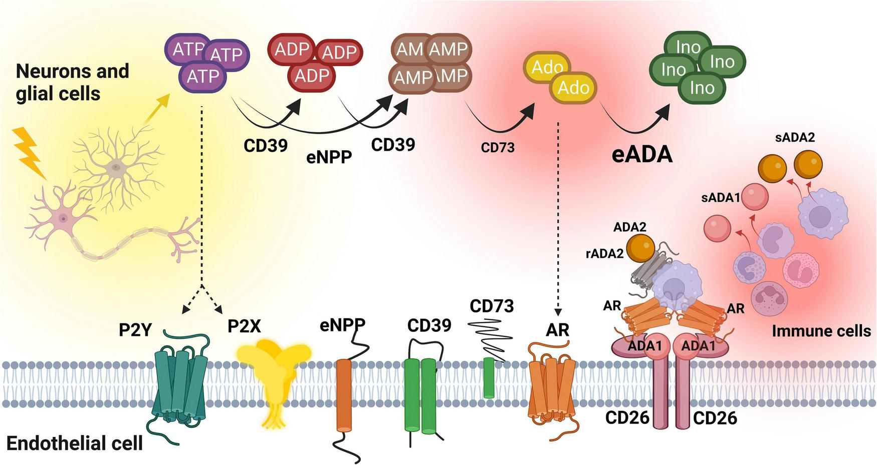 The concept of extracellular nucleotide and adenosine metabolism in multiple sclerosis. ATP, adenosine triphosphate; ADP, adenosine diphosphate; AMP, adenosine monophosphate; Ado, adenosine; Ino, inosine; CD39, ecto-nucleoside triphosphate diphosphohydrolase 1; CD73, ecto-5’-nucleotidase; eNPP, ecto-pyrophosphatase/phosphodiesterase; eADA, ecto-adenosine deaminase; ADA1, adenosine deaminase 1; ADA2, adenosine deaminase 2; sADA1, soluble adenosine deaminase 1; sADA2, soluble adenosine deaminase 2; AR, adenosine receptors; CD26, adenosine deaminase complexing protein 2/cluster of differentiation 26; P2X, purinergic 2X receptor subtype, P2Y, purinergic 2Y receptor subtype. Created with BioRender.com.