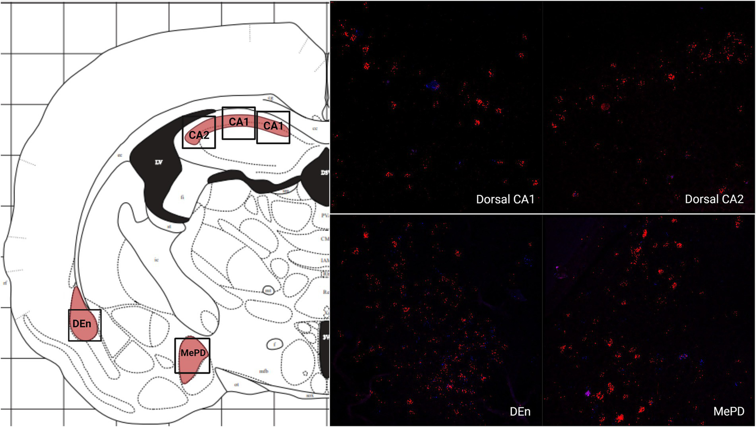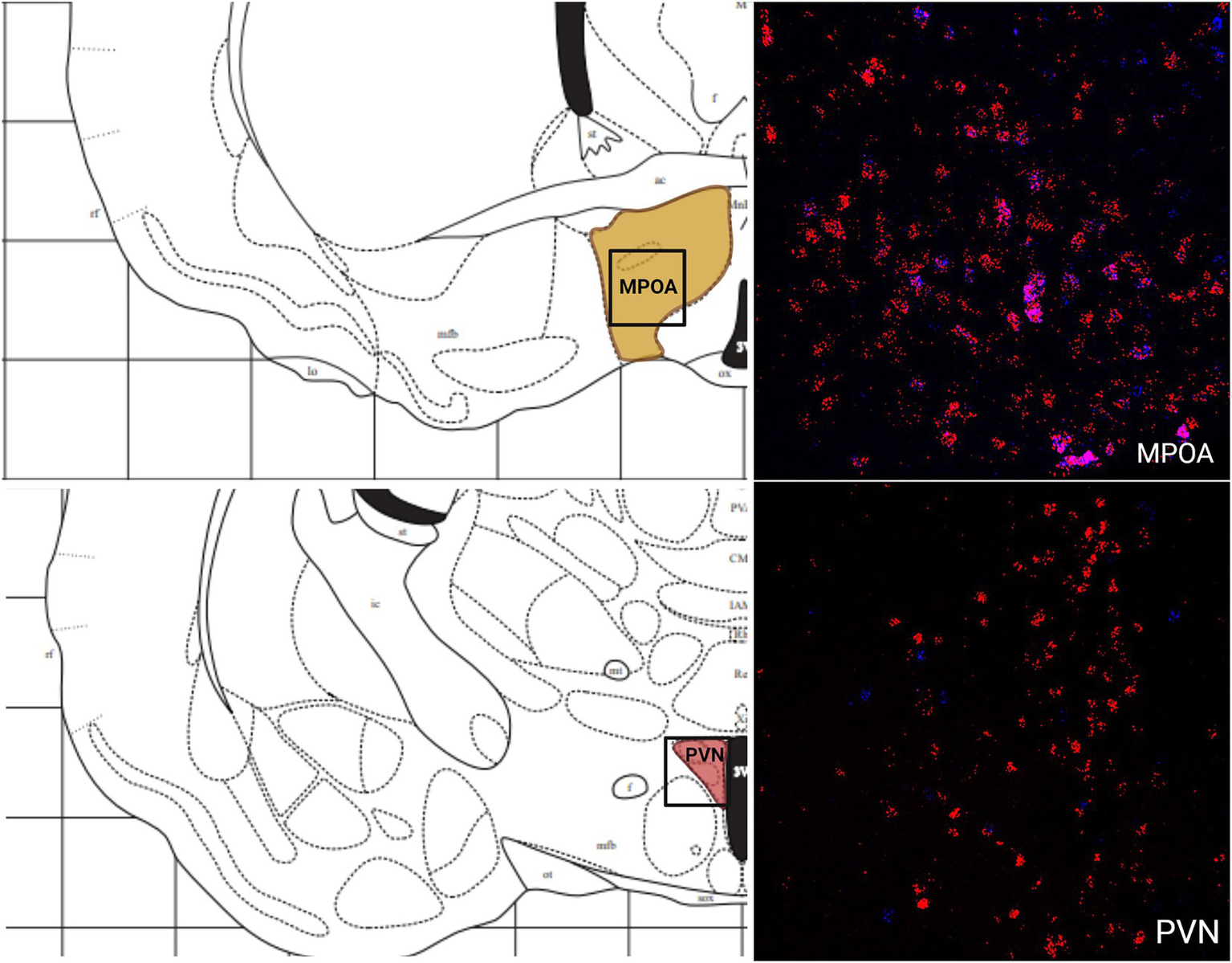 Slides were rinsed twice in phosphate-buffered saline (9.8 g/l PBS), which contains 80 g/l sodium chloride, 14 g/l sodium phosphate dibasic, 3 g/l sodium phosphate monobasic, and 2 g/l potassium chloride (Fisher Scientific), at pH 7.4 and then dehydrated for 5 min each in 50, 70, 100, and 100% ethanol at room temperature. After air-drying for 5 min, hydrophobic barriers were drawn around the tissue to minimize loss of applied solutions. Slides were treated with Protease IV, incubated at room temperature for 30 min, and washed twice for 2 min in PBS. Two probes targeting Syrian hamster sequences were created by Advanced Cell Diagnostics (Newark, CA, United States) and used for the procedure: Mau-MC4R-C1 (mRNA encoding melanocortin-4 receptor, MC4R); GenBank accession number (XM_005074647.3, target nt region 519–1,483) and Mau-MC3R-C2 (mRNA encoding melanocortin-3 receptor, MC3R); GenBank accession number (XM_005074460.4, target nt region 932–1997). Probes were applied such that each tissue received 75 μl of solution that contained a 50:50 ratio of probe diluent (Advanced Cell Diagnostics) and probe mixture. Each probe mixture contained a 50:1 ratio of C1:C2 (each tissue received 37.50 μl of probe diluent, 36.75 μl of C1 and 0.75 μl of C2). Tissues were incubated at 40°C for 2 h. Following incubation, tissues were washed twice for at room temperature for 2 min each with washing buffer solution (8.7 g/l of sodium chloride, 4.41 g/l of sodium citrate, 3 g/l of sodium dodecylsulfate) based on Wang et al. (2012). Tissues were then incubated with amplifying probes (AMP1, AMP2, and AMP3, Advanced Cell Diagnostics) at 40°C for 30 min, 30 min, and 15 min, respectively. Slides were washed with washing buffer solution twice at room temperature for 2 min each between each incubation step. Fluorescently labeled probes (Akoya Biosciences, Marlborough, MA, United States) were applied with the following assignments: MC4R-C1 with Opal 570 nm, concentration 1:750, and MC3R-C2 with Opal 520 nm, concentration 1:750. TSA buffer (Advanced Cell Diagnostics) was mixed with each dye to achieve the desired dilution. For each fluorescent probe, slides were first incubated with horseradish peroxidase (HRP) (Advanced Cell Diagnostics) for the corresponding channel at 40°C for 15 min, then with the probe at 40°C for 30 min, and finally with HRP blocker (Advanced Cell Diagnostics) at 40°C for 15 min. Slides were washed twice with washing buffer solution for 2 min each between each incubation step. Slides were coverslipped with ProLong Gold Antifade Mountant (Advanced Cell Diagnostics) and stored at 4°C. An example of the staining can be seen in Supplemental Figure 1.