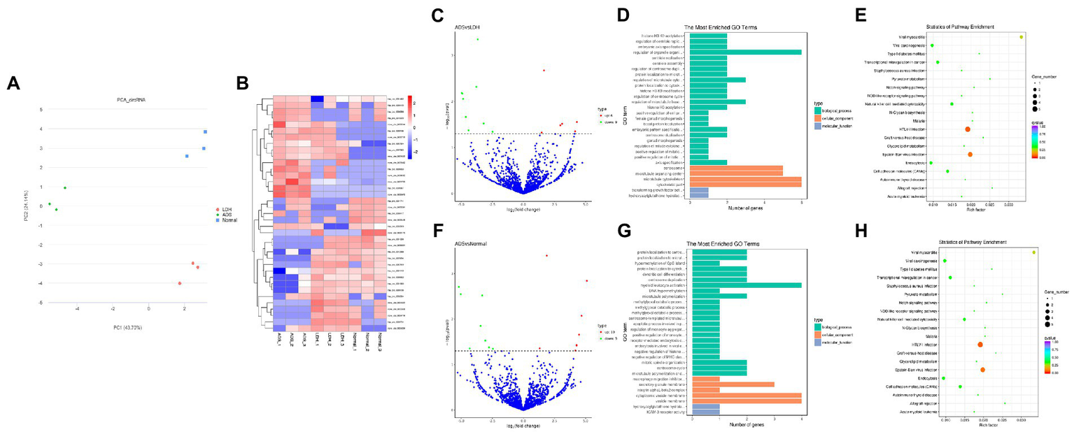 Identification of differentially expressed circRNAs in ADS (A) Principal component analysis shows the clustering of circRNA in different samples. (B) Hierarchical clustering illustrates distinguished expression differences of circRNA and between the three groups and homogeneity between groups. (C) Volcano plot showing differentially expressed circRNAs in ADS and LDH group. (D) The 20 most enriched Gene Ontology terms for the parental genes of the differentially expressed circRNAs in ADS and LDH group. (E) The 20 most enriched KEGG pathways for the differentially expressed circRNAs in ADS and LDH group. (F) Volcano plot showing differentially expressed circRNAs in ADS and Normal group. (G) The 20 most enriched Gene Ontology terms for the parental genes of the differentially expressed circRNAs in ADS and Normal group. (H) The 20 most enriched KEGG pathways for the differentially expressed circRNAs in ADS and Normal group. Enriched GO terms are on the vertical axis, and the number of annotated differentially expressed genes associated with each GO term is indicated on the horizontal axis. The size of the symbol represents the number of genes, and the colors represent p-value in KEGG.