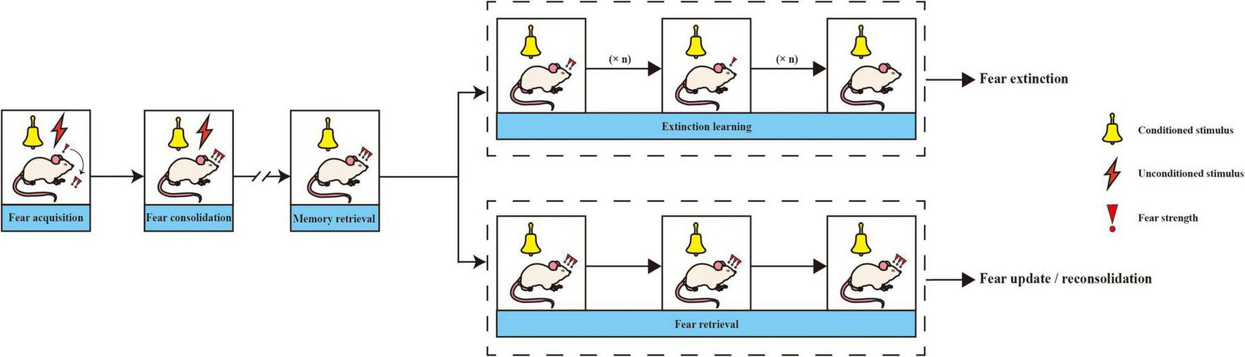 Classical (or Pavlovian) fear conditioning is an effective behavioral paradigm for studying the mechanisms of associative fear learning and memory processes. In rodents, fear indicators are typically assessed by freezing behaviors (Bouton and Bolles, 1980), which is characterized by immobility and the absence of any movement except for breathing. Freezing is a potent conditioned fear response in rats and mice. And it has a great advantage over many other fear measures because freezing is not a typical response of rats or mice to ordinary new stimuli (Anagnostaras et al., 2010). A computerized method based on latency between photobeam interruption measures is used as a reliable scoring criterion in mice, which can reduce bias or inconsistencies (Valentinuzzi et al., 1998). It is important to note that when testing different strains of mice, it would be essential to validate the testing or scoring procedure (Valentinuzzi et al., 1998). To avoid artificially inflated lighting sources and thus ensure freezing behavior is induced in a well-controlled manner, it is suggested to report Lux and control the lighting properly (Neuwirth et al., 2022). When a neutral cue or context [a sound, light, or conditioned stimulus (CS)] occurs with a highly aversive signal or unconditioned stimuli (US) and leads to fear behaviors or conditioned fear responses (CRs), which include freezing, a systemic response to behavior besides breathing, fear acquisition arises [47]. The training box used in the Pavlov paradigm itself can be used as an environmental situational stimulus (CS), which is matched with an aversive plantar shock (US) multiple times. Animals learn the connection between the CS and the US and obtain the fear response (CR) to the environment. This process is called contextual fear conditioning (CFC). If a cue [usually an auditory stimulus (CS)] is matched with a foot shock (US) multiple times during the training, the auditory stimulus (CS) will be separated from the environment and associated with the foot shock (US) to form the CR to the auditory stimulus (CS). This process is called cued fear conditioning (Maren et al., 2001). The exposure of an individual to CS stimulation is sufficient to trigger a fear response (CR). This process is called retrieval of fear memory (Pape and Pare, 2010). Following retrieval, previously formed memory is destabilized, which is similar to the unstable state when the memory has just been acquired, and requires new protein synthesis to restabilize, a process referred to as reconsolidation. Reconsolidation acts to stabilize, update, or integrate new information into long-term memories (Izquierdo et al., 2016). Memory-dependent reconsolidation modification may serve as a therapeutic target to modulate the enhanced fear response commonly associated with debilitating mental disorders. People with PTSD are unable to modify or weaken memories through the reconsolidation process (Ferrara et al., 2019). Once the animals have acquired a CR, repetition of the CS alone without the US usually reduces the CR: this is called extinction. Fear extinction indicates the formation of a new competing memory, which is similar to fear conditioning, rather than the elimination of the original fear memory. In this process, the organism is enabled to acquire an association between CS and no-US, which competes with the conditioned fear memory (Bouton and Bolles, 1980). It is known that extinction generates a new memory engram, so it can be regarded as a process of active learning (Maddox et al., 2019).