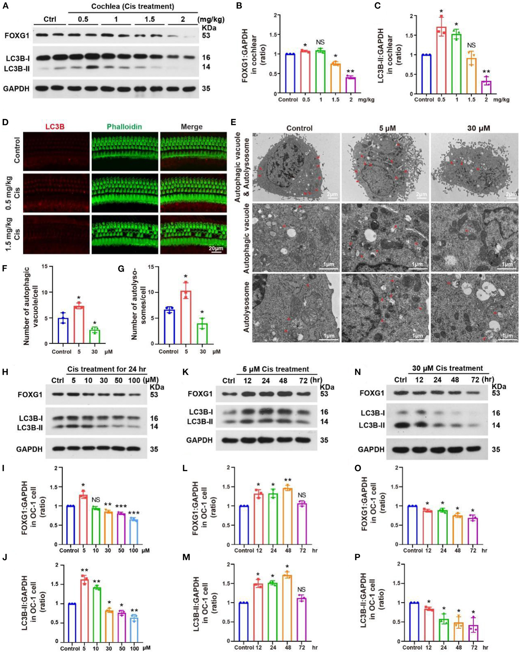 Changes in FOXG1 and autophagy levels in the cochlea and OC-1 cells after cisplatin treatment. (A) Western blotting of changes in FOXG1 and LC3B levels in the cochlea after treatment with different cisplatin concentrations. (B, C) Quantification of the western blotting in (A). (D) Immunofluorescence staining for LC3B and phalloidin in the cochlea after cisplatin treatment. (E) TEM of changes in autophagic vacuoles and autolysosomes after treatment with 5 or 30 μM cisplatin for 24 h. (F) Quantification of the autophagic vacuoles changes in (E). (G) Quantification of the autolysosomes changes in (E). (H) Western blotting of changes in FOXG1 and LC3B levels after treatment with different cisplatin concentrations for 24 h. (I, J) Quantification of the western blotting in (H). (K) Western blotting of changes in FOXG1 and LC3B levels after treatment with 5 μM cisplatin for different times. (L, M) Quantification of the western blotting in (K). (N) Western blotting of changes in FOXG1 and LC3B levels after treatment with 30 μM cisplatin for different times. (O, P) Quantification of the western blotting in (N). *p < 0.05, **p < 0.01, ***p < 0.001.
