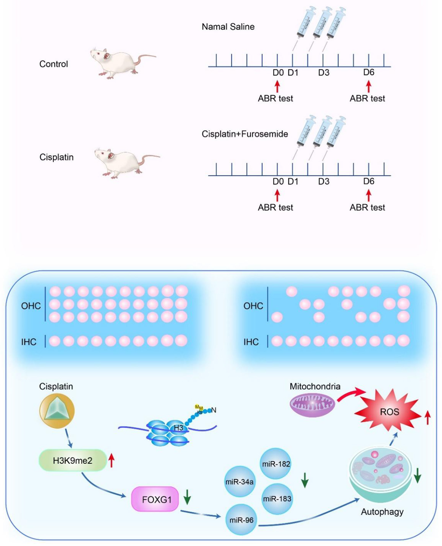 Cisplatin is clinically used to treat tumors but has ototoxic side effects. Studying the mechanism of cisplatin-induced ototoxicity is crucial in hearing research. In this study, we conducted related mechanistic experiments since FOXG1-related epigenetics appeared to play a role in cisplatin-induced HC damage.