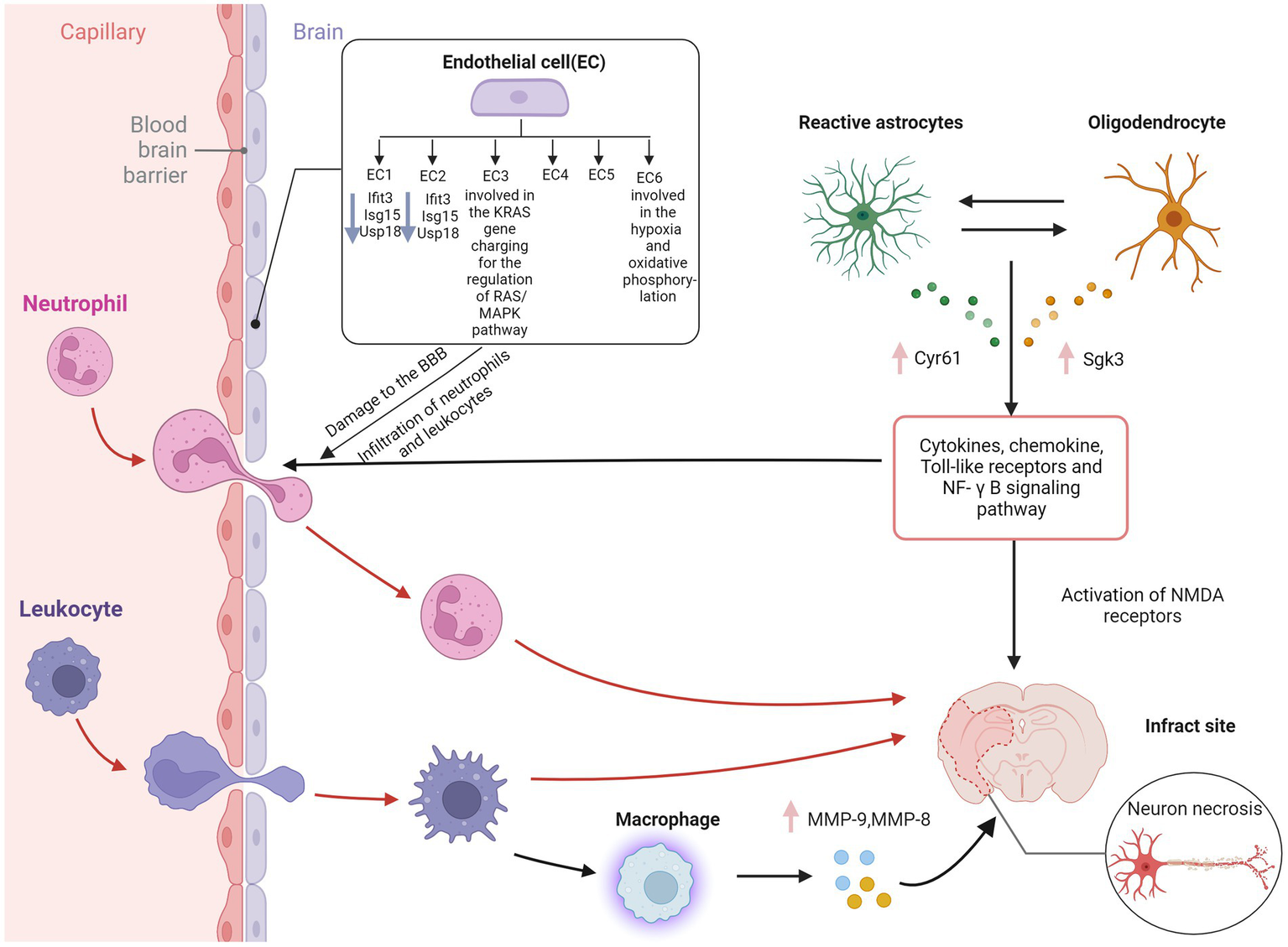 The glial cells in the CNS mainly include astrocytes, microglia, and oligodendrocytes. Different glial cells are interconnected to neurons and surrounding blood vessels, forming a complex information exchange network (Huang et al., 2019). Glial cells support nerve transmission, maintain extracellular ion balance, insulate axons, and accelerate electrical signal transmission (Allen and Lyons, 2018). Guo et al. showed that in the MCAO group, Cyr61 in astrocytes and Sgk3 in oligodendrocytes were overexpressed (Guo et al., 2021). These genes might be potential therapeutic targets in this stage of AIS. Overexpression of the CYR61 gene may contribute to the survival of astrocytes after AIS. Although there is a lack of research on AIS, previous studies have shown that the CYR61 gene is closely related to stress and tumor cell proliferation (Sun et al., 2020). A study examining the relationship between astrocytes and BBB in heat stroke rats showed that astrocytes, but not neuronal DEGs, were rich in clusters of leukocyte chemotaxis and cytokine signals as cytokines/chemokines, toll-like receptors, and NF-κB signaling pathway (Niu et al., 2017). These chemokine-related genes were not found in neurons but combined into a regulatory sub-network in the protein–protein interaction network of astrocyte DEGs. In primary cultured astrocytes, scRNA-seq and qPCR showed upregulation of C6, CCL3, and CCR1 after heat stress but downregulation in heat stroke rats (Niu et al., 2017), while the transcriptional levels of CCL3 and CCR1 were downregulated in heat stroke rats (Audet et al., 2016). Glial cells are one of the essential components of BBB. Further exploring the regulatory mechanism of BBB injury might be one of the targets of AIS intervention in the future.