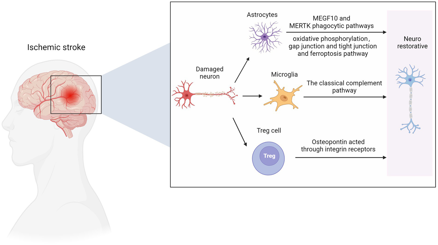 Nerve repair in ischemic stroke. MEGF10, multiple EGF like domains 10; MERTK, MER proto-oncogene, tyrosine kinase. Figure was created with Biorender.com.