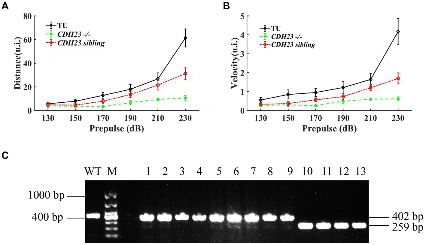 The results of startle response for zebrafish juveniles. (A) Under the action of prepulse of different intensities, the movement distance of cdh23 homozygous mutants and heterozygous juveniles was significantly lower than that of the wild type at the same time. (B) Under the stimulation of prepulse of different intensities, in cdh23 homozygous mutants and sibling juveniles, the movement speed of sibling juvenile fish is significantly lower than that of wild type. All zebrafish juveniles used developed to 6 dpf. (C) Genotyping results of zebrafish juveniles after startle response.