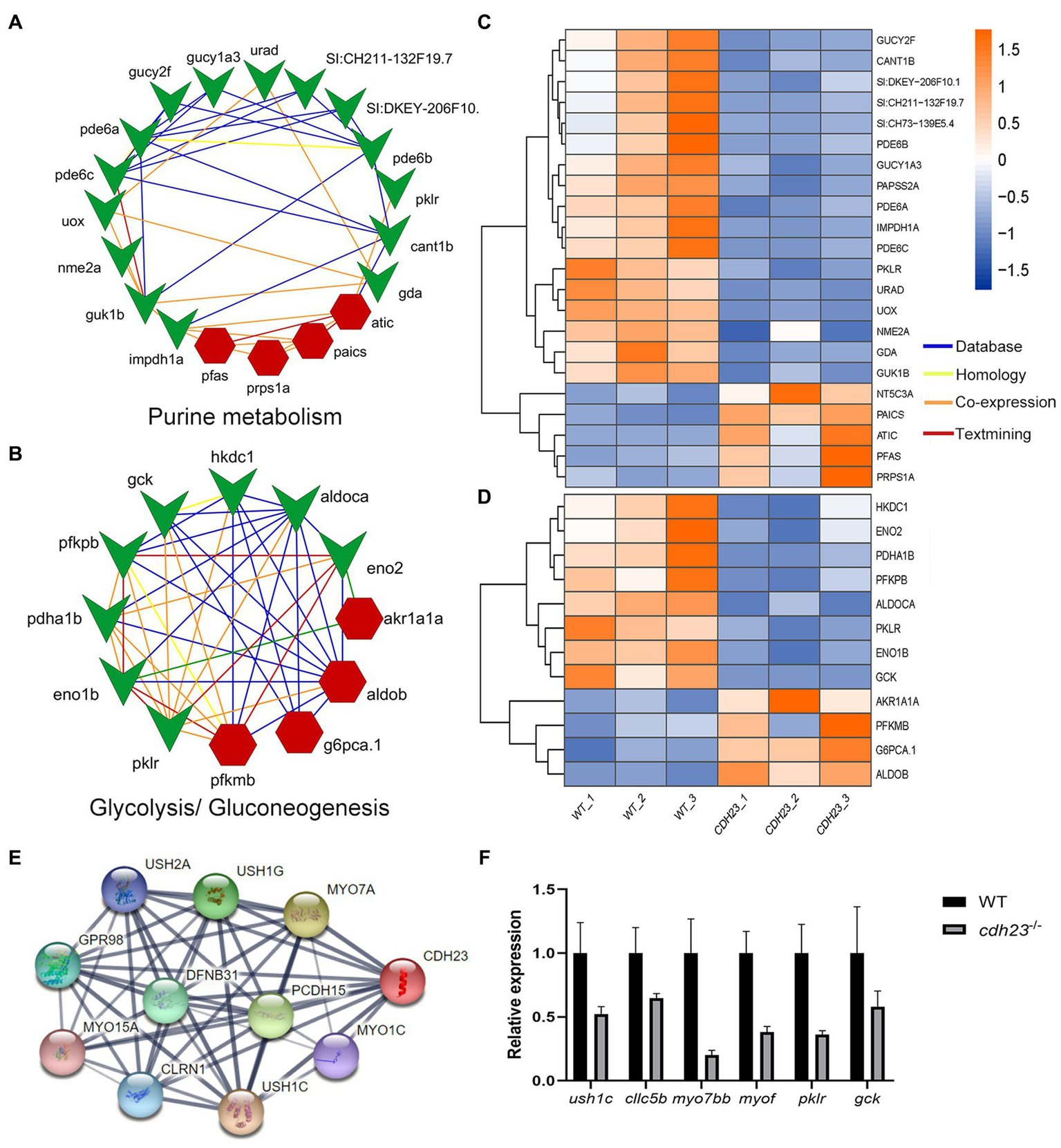 Network construction and visualization based on specific pathway and gene. (A,B) Key genes involved in glycolysis/gluconeogenesis and purine metabolism and their interactions; (C,D) The expression heatmap of these genes between the control and the cdh23−/− group. (E) Genes closely related to cdh23 in the string database. (F) RT-qPCR analysis evaluating the expression change of genes related to cdh23.