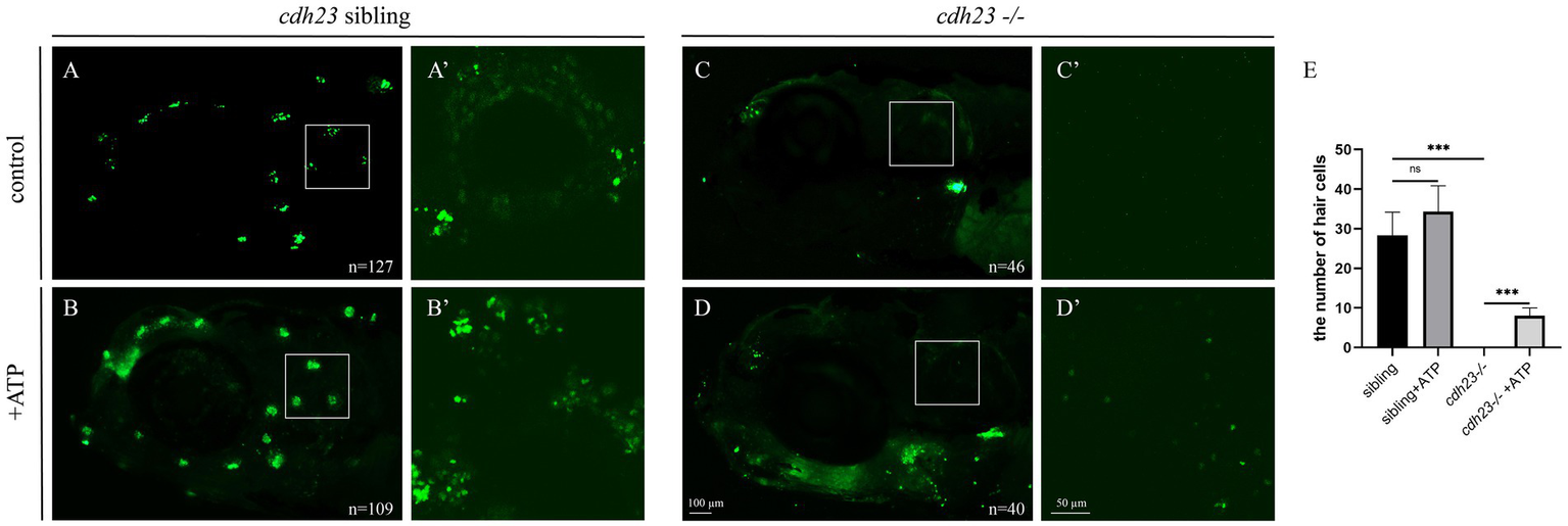 Transcriptome and qPCR results indicated that loss of cdh23 resulted in impaired metabolism and insufficient ATP. As P2RX7 is an ATP-gated ion channel, we next determined whether the shortage of ATP caused YO-PRO-1 cannot enter into hair cells. We performed ATP compensation experiment in sibling embryos after the YO-PRO-1 assay as previously described (Figure 7A). We can see that the hair cell in the inner ear and lateral line cells can be stained by YO-PRO-1 (Figures 7A,A'), while the signal in cdh23−/− embryos is completely lost (Figures 7C,C'). Next, we added 3 μM of ATP solution in E3 water for 6 h, the result showed that the hair cells still have fluorescence signal in the sibling group (Figures 7B,B'), while in the cdh23−/− group, we can see the YO-PRO-1 signal was partially restored in the inner ear and lateral line hair cells (Figures 7D,D'). These results suggest that the knockout of cdh23 resulted in impaired metabolism caused by the shortage of ATP and ATP application can partially recover the function of hair cells.