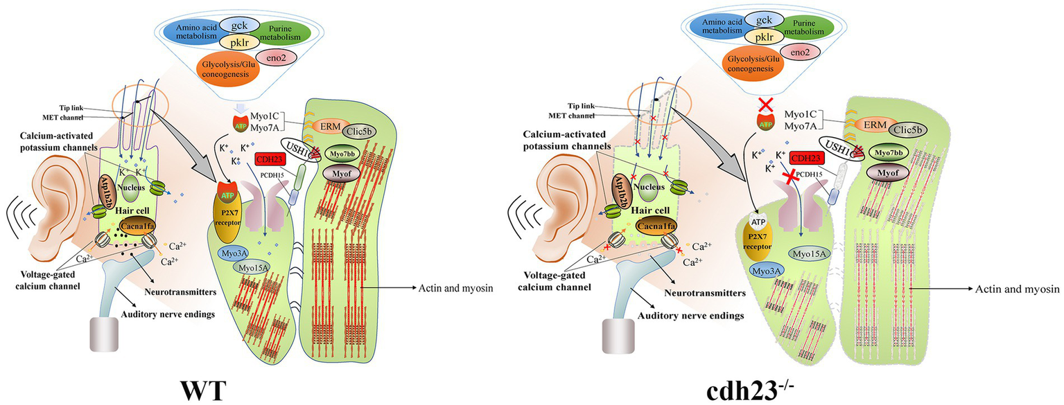 Schematic diagram of the potential molecular mechanism regarding cdh23 on congenital hearing loss. In WT, candidate genes (clic5b, myof, myo7bb) may be associated with the cytoskeleton of actin and participate in the movement of cilia in inner ear hair cells. Purine and amino acid metabolism yield sufficient ATP, and when ATP binds to the P2X7 receptor, these genes (atp1b2b, cacna1fa) may mediate the opening of related ion channels, thereby completing the acoustic-electric conversion. While in cdh23−/− embryos, purine metabolism is disrupted, resulting in a shortage of ATP, leading to dysfunction of the ion channel P2X7 receptor, and hence interrupting the acoustic-electric conversion, resulting in congenital hearing loss.