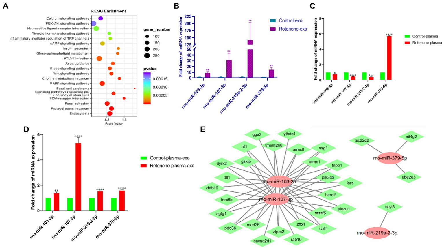 To screen out miRNAs that correlate with PD and play a key role in the development of PD, we screened the top 25 miRNAs according to the concentrations and fold changes of miRNA expression (TPM > 10, p < 0.01, and |log2FC| > 2; Table 1). To analyze the potential functions and pathways regulated by these miRNAs, target predictions for the 25 miRNAs were performed by miRanda and RNAhybrid, and the overlapped targets were annotated by KEGG (Figure 5A).