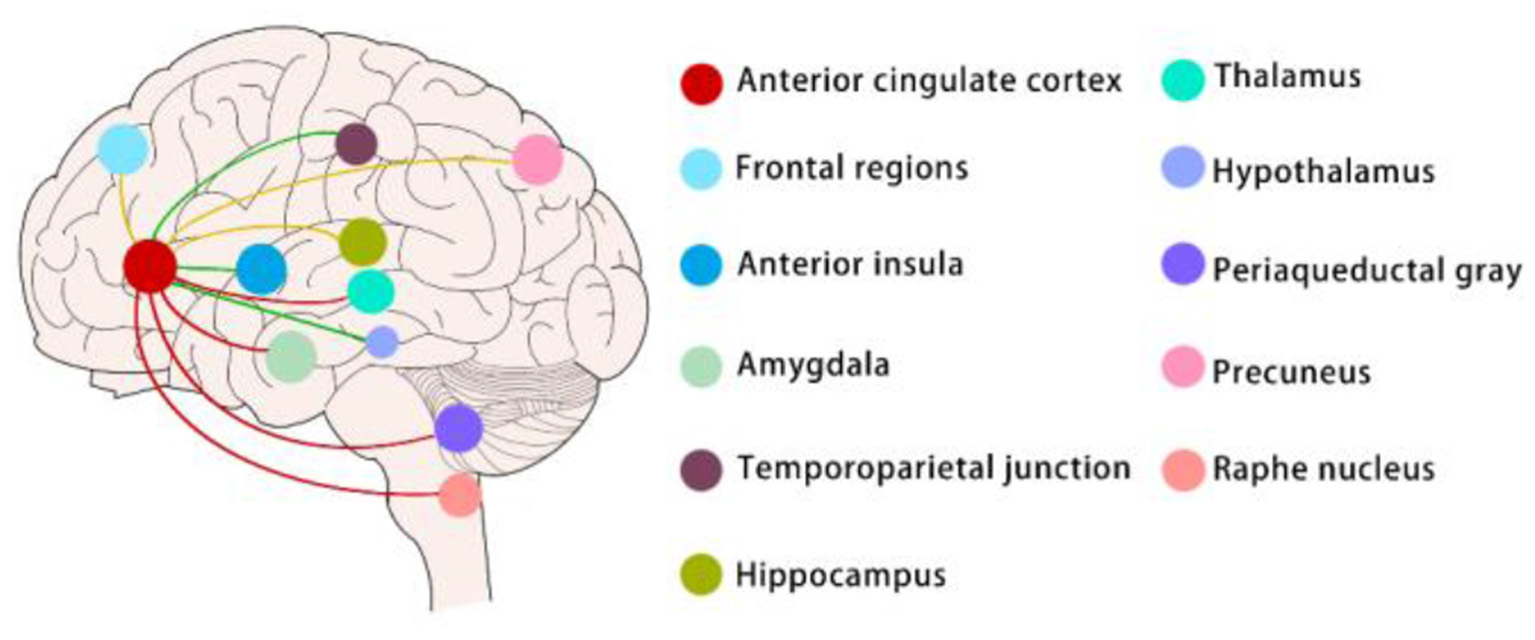 CGRP1, calcitonin gene-related peptide 1; CeA, central nucleus of the amygdala; DRN, dorsal raphe nucleus; LC, locus coeruleus; ACC, anterior cingulate cortex; sgACC, subgenual ACC; FC, functional connectivity; LTD, long-term depression; LTP, long-term potentiation; VTA, ventral tegmental area; PFC, prefrontal cortex; NAc, nucleus ambiguus; RMTg, rostromedial tegmental nucleus; DA, dopamine; Sp5C-LPBN, spinal trigeminal subnucleus caudalis to the lateral parabrachial nucleus; BNST, bed nucleus of the stria terminalis; vlPAG/DR, ventral lateral aqueduct periaqueductal gray/dorsal fissure; RVM, rostral ventromedial medulla; NE, norepinephrine; SNRI, serotonin-noradrenaline reuptake inhibitors; TH, tyrosine hydroxylase; CRF, corticotropin-releasing factor; D1 and D2, dopamine receptor 1 and 2; CCI, chronic constriction injury; NAc, nucleus accumbens; ADHD, attention-deficit/hyperactivity disorder; SSRI, selective serotonin reuptake inhibitor; 5-HIAA, 5-Hydroxy indoleacetic acid; IDO, indoleamine-2,3-dioxygenase; TRYCAT, tryptophan catabolite pathways; 5-HTT, 5-HT transporter; rs-fMRI, resting-state functional magnetic resonance imaging; GABA, gamma-aminobutyric acid; GABAA/BR, GABAA/B receptors; GIRK, G proteingated inwardly-rectifying K+; GAD, glutamic acid decarboxylase; GAT, GABA transporter; STG, superior cerebral gyrus; SPECT, single-photon emission computed tomography; GABAA-BZR, GABAA-benzodiazepine receptor; DMN, dorsomedial nucleus; Oxt, Oxytocin; PVN, paraventricular; SON, supraoptic nuclei; ICV, intracerebroventricular.