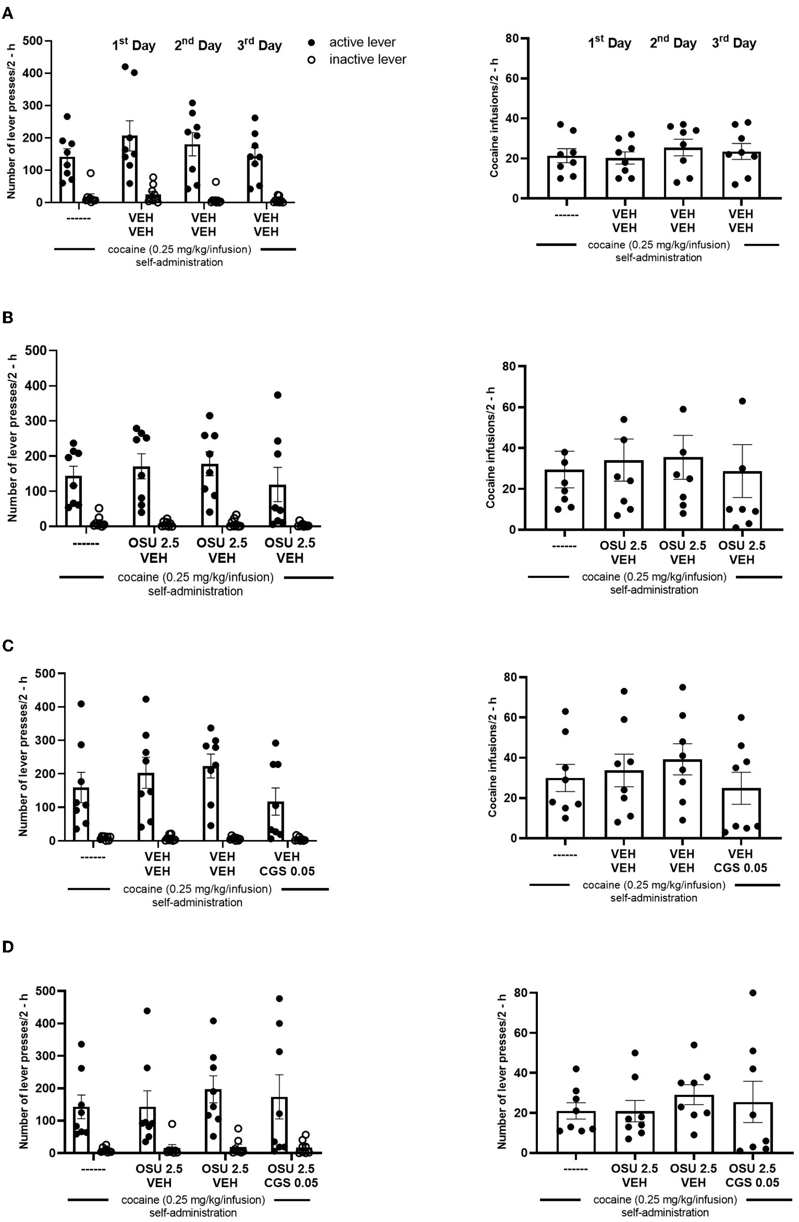 (A) Effects of repeated administration of vehicle (VEH; 0.9% NaCl, s.c. or i.p.), (B) OSU-6162 (OSU; 2.5 mg/kg, s.c.), (C) CGS 21680 (CGS; 0.05 mg/kg, i.p.), and (D) OSU-6162 (OSU; 2.5 mg/kg, s.c.) plus CGS 21680 (CGS; 0.05 mg/kg, i.p.) treatments on cocaine (0.25 mg/kg/infusion) self-administration under the FR-5 schedule of reinforcement in rats. The numbers of “active” and “inactive” lever presses (left panels) as well as cocaine infusions (right panels) after 2-h sessions are expressed as the means ± SEM of the data from eight rats/group.