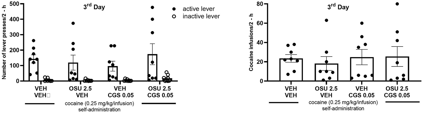 No difference was observed between the groups assigned as vehicles or the OSU-6162 or CGS 21680 groups in the context of “active” and “inactive” lever presses and cocaine infusions (Figure 2). OSU-6162 in a dose of 2.5 mg/kg given in combination with CGS 21680, 0.05 mg/kg, did not change the number of “active” and “inactive” lever presses [group × lever F(3,56) = 0.174, p = 0.91; group F(3,56) = 0.045, p = 0.71; lever F(1,56) = 28.58; p = 0.0001] and cocaine infusions [F(3,28) =0.14; p = 0.09; Figure 3].