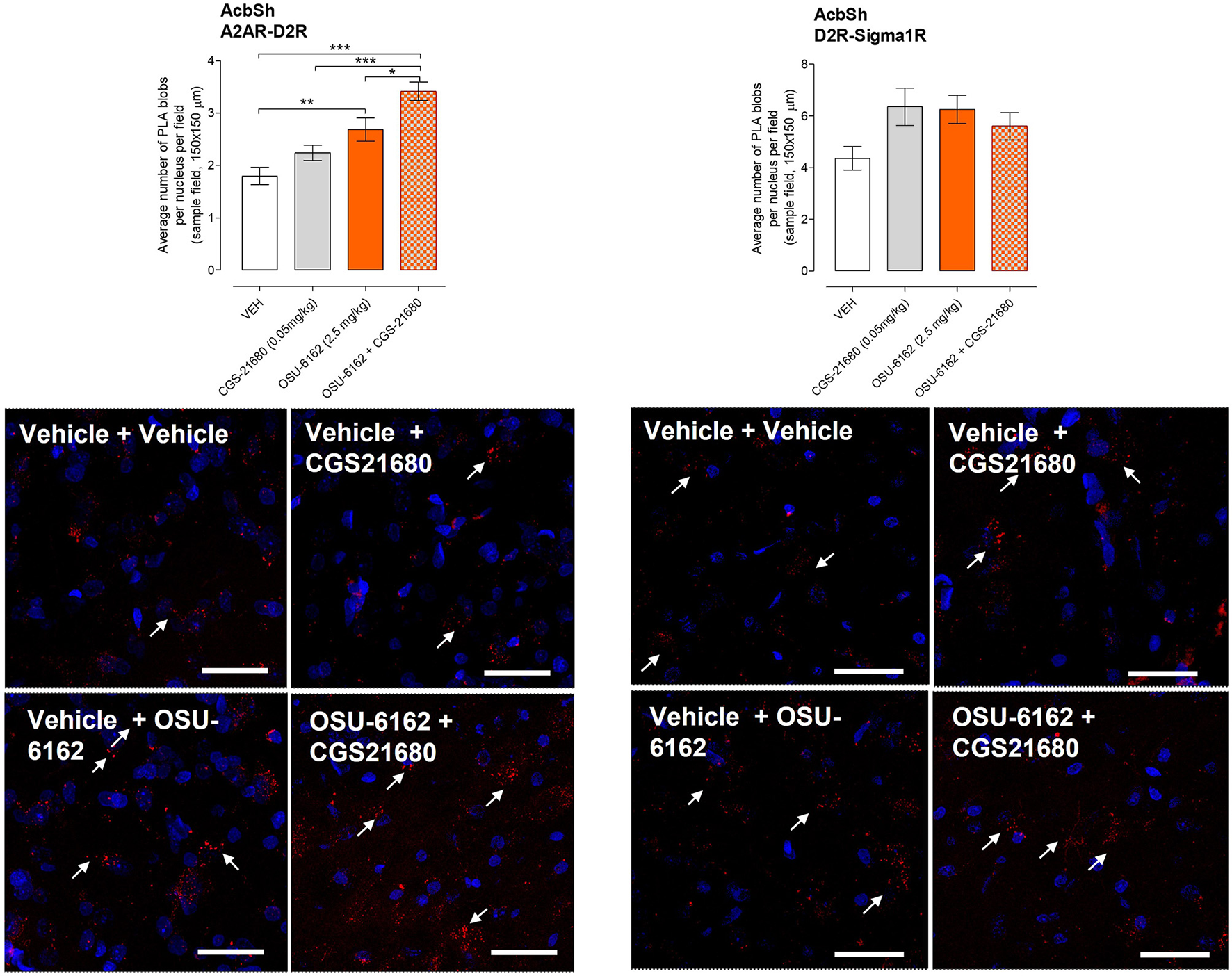 Effects of pharmacological treatment on cocaine self-administration (SA) on A2AR-D2R and D2R-Sigma1R heteroreceptor complexes using proximity ligation assay (PLA). (Bottom panels) The heteroreceptor complexes are shown as red puncta, and their average number has been determined per nucleus per sample field using confocal laser microscopy in the nucleus accumbens shell (AcbSh). (Top panels) The effects of CGS 21680 (CGS; 0.05 mg/kg, i.p.) and/or OSU-6162 (OSU; 2.5 mg/kg, s.c.) in cocaine-self-administrating rats using the same doses as reported in Figure 5 are shown in terms of density changes in their heterodimers compared to the density found in vehicle (VEH; 0.9% NaCl) treated cocaine-self-administrating rats. Significant changes were observed in the A2AR-D2R heterocomplexes as studied in the nucleus accumbens shell. The OSU-6162 treatment cocaine SA group was significantly increased compared to the vehicle SA group (**p < 0.01). The combined treatment group showed the strongest increase in its density with highly significant increases against the vehicle and CGS 21680 SA groups (***p < 0.001) and with a significant increase against the OSU-6162 group (*p < 0.05). Statistical analysis was performed by a one-way ANOVA followed by the Tukey post hoc analysis to obtain the means ± SEM of the data from four rats/group.