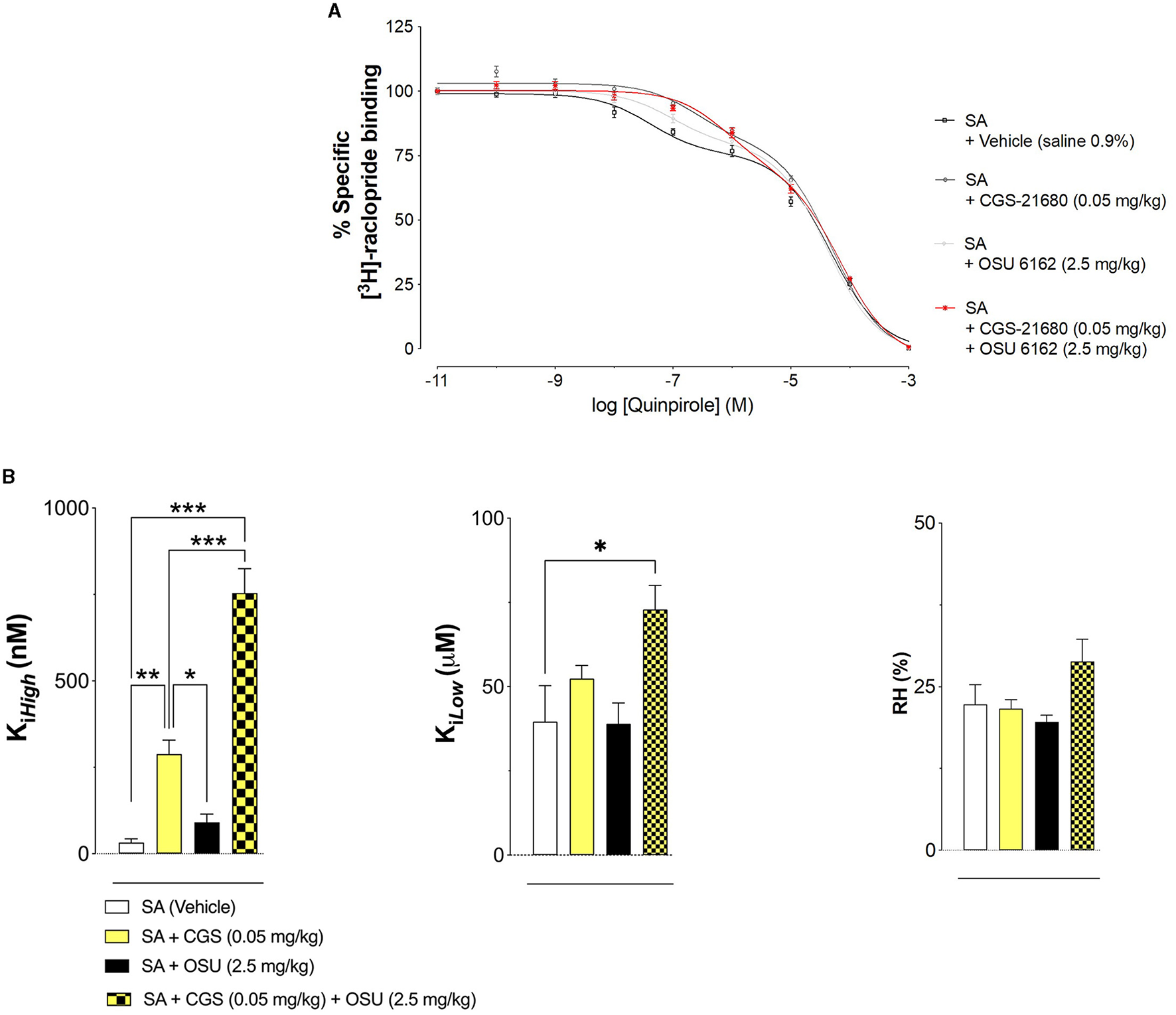 Figure 5 shows the effects of pharmacological treatments on cocaine self-administration (SA) on D2R high-and low-affinity Ki values in the ventral striatum produced by A2AR agonist CGS 21680 (CGS 0.05 mg/kg) and/or the Sigma 1R ligand OSU-6162 (OSU 2.5 mg/kg) and compared with vehicle (control group; VEH: 0.09% NaCl). It shows a strong reduction of D2R affinity in the nucleus accumbens after combined treatment with OSU-6162 and CGS 21680, involving both high-and low-affinity Ki values.
