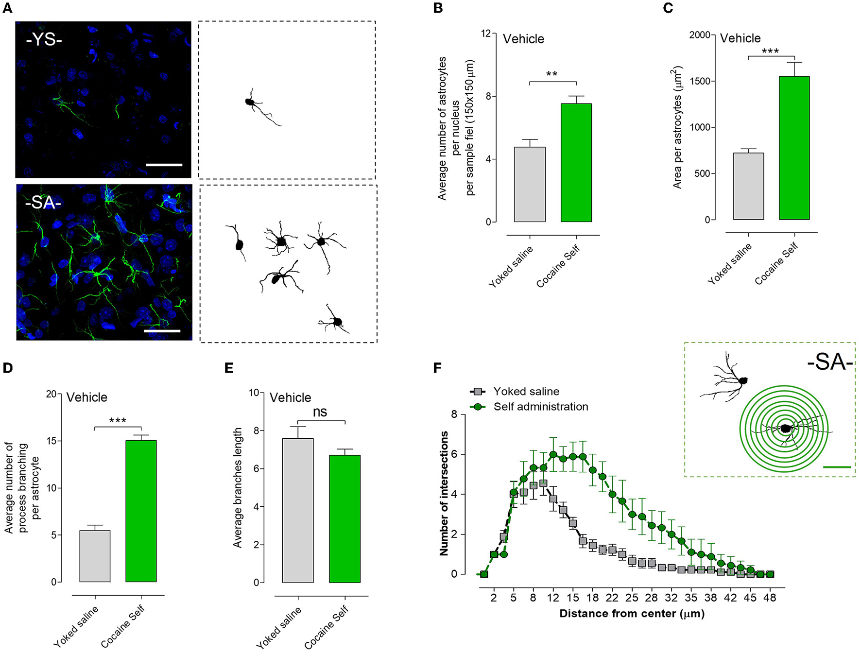 Structural changes in astrocytes after cocaine self-administration compared to the yoked saline controls procedure in rats in terms of the number of astrocytes and their process branching in the nucleus accumbens shell. (A) Representative GFAP images of the GFAP-positive astrocytes with their process branching are presented after cocaine self-administration or after the yoked saline procedure are also given. (B) Cocaine self-administration vs. yoked saline controls produced a significant increase in the density of astrocytes per nucleus per sample field (**p < 0.01, Mann–Whitney U-test, means ± SEM, n = 8 rats) in the nucleus accumbens shell, visualized in green with GFAP immunoreactivity. (C) In addition, a significant change in the area was observed. (D) Cocaine self-administration caused a highly significant and substantial increase in the number of GFAP-positive branches per astrocyte (***p < 0.001, Mann–Whitney test, means ± SEM, n = 8 rats) in the nucleus accumbens shell vs. yoked saline controls. (E) However, a non-significant (ns) change in the average branch length was observed. (F) illustrates the Sholl method for an astrocyte, labeled GFAP, in cocaine self-administration of an accumbens shell sample. A total of 10 astrocytes per group were investigated, and the results clearly indicated an increase in the number of intersections (hence cell processes) with the entire range of astrocytes being compared between the cocaine-self administration group and the yoked saline group in (B, C).
