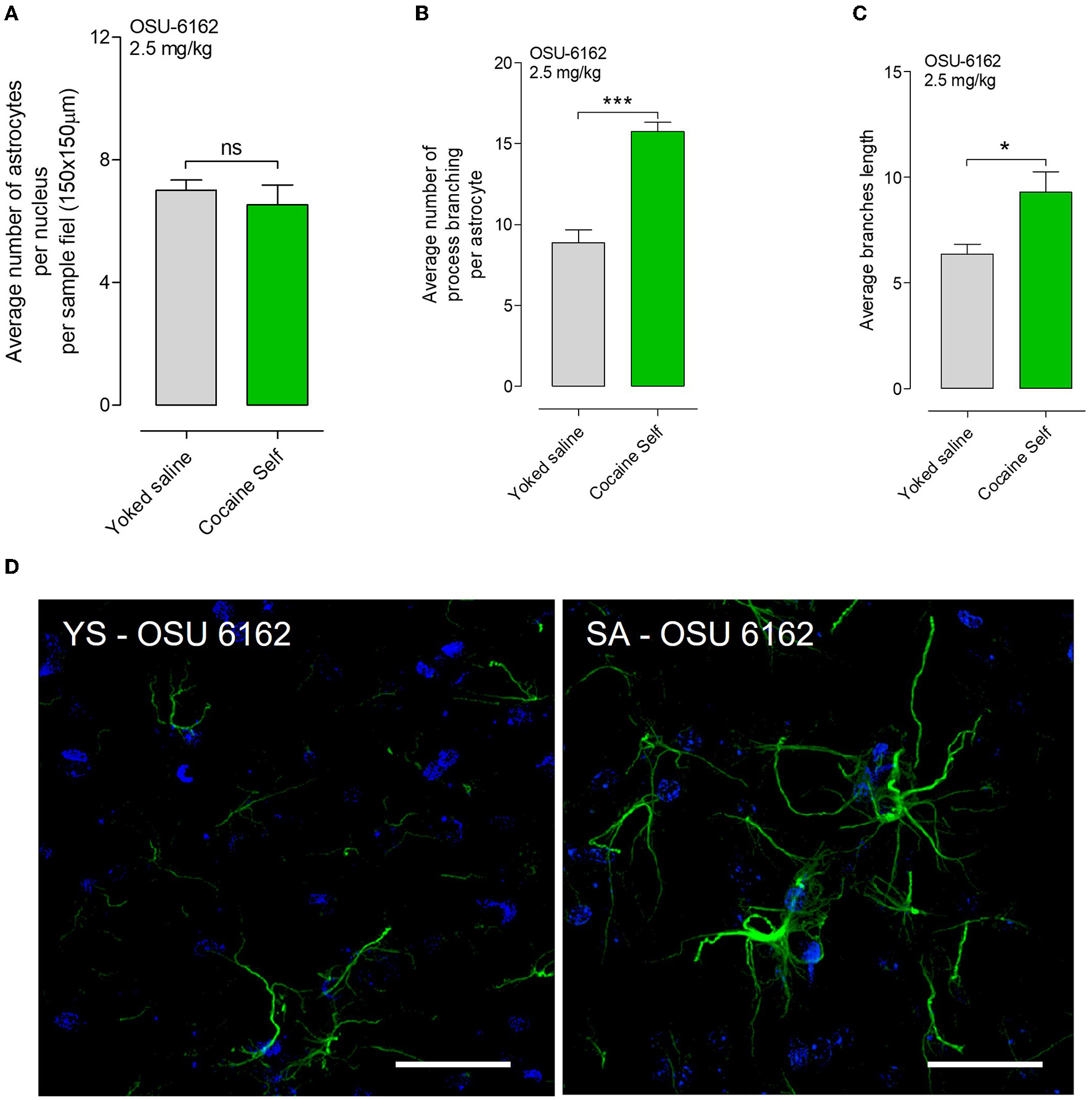 (A) OSU-6162 with low dose (OSU 2.5 mg/kg) treatment produced a non-significant (ns) change in the density of astrocytes per nucleus per sample field (p > 0.05, Mann–Whitney U-test, means ± SEM, n = 8 rats) in the nucleus accumbens shell, visualized in green with GFAP immunoreactivity after cocaine self-administration vs. yoked saline controls. (B) However, OSU-6162 treatment caused a highly significant and substantial increase in the number of GFAP-positive branches per astrocyte (***p < 0.001, Mann–Whitney U-test, means ± SEM, n = 8 rats) in the nucleus accumbens shell of cocaine-self administration rats vs. yoked saline controls. (C) Moreover, significant changes in the average branch length were observed (*p < 0.01, Mann–Whitney U-test, means ± SEM, n = 8 rats). (D) Representative GFAP images of the GFAP-positive astrocytes with their process branching are presented in cocaine self-administration or yoked procedure after OUS-6162 low-dose treatment (OSU 2.5 mg/kg). There is a clear-cut increase visualized in the GFAP branching of the astrocytes after OSU6162 treatment in cocaine self-administration compared to its treatment in yoked saline rats.