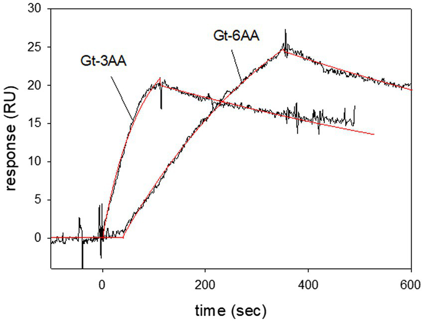 The extreme C-terminus of the α-subunit in bovine transducin interacts with rhodopsin during light activation (Herrmann et al., 2006; Scheerer et al., 2008). We systematically truncated the C-terminus of Gtα/Giα by three and six amino acids and tested its binding capability to LWO-2. All purified truncated Gtα/Giα variants were functional as tested by AlF4−/Trp fluorescence assay (Supplementary Figure S2). SPR interaction studies using immobilized truncated Gtα/Giα variants showed interaction with LWO-2. Removing three amino acids (Gt-3AA) did not influence the binding kinetics, since we observed similar association and dissociation rate constants and a KD-value in the lower nanomolar range (Figure 5). Three different sets injecting 120 nM LWO2 resulted in a KD = 7.3 nM ± 1.2 nM, which was in the range that we observed with non-truncated Gtα/Giα. Interaction of 100 nM LWO2 with Gt-6AA yielded a KD = 34.5 nM ± 13.8 nM. Thus, the affinity decreased by a factor 1.6 (34.5/21.4), when compared with the non-truncated variant. This decrease was mainly caused by the lower association rate constant as shown in Figure 5. When we increased the concentration of the peptide, we recorded larger RU values, but the binding kinetics did not obey to a simple Langmuir binding model (1:1). Instead, satisfying fits using the global fit approach were only obtained with additional assumptions concerning the binding process on the sensor chip surface (for example, complex formation with a sequential conformational change, see Supplementary Figure S3).