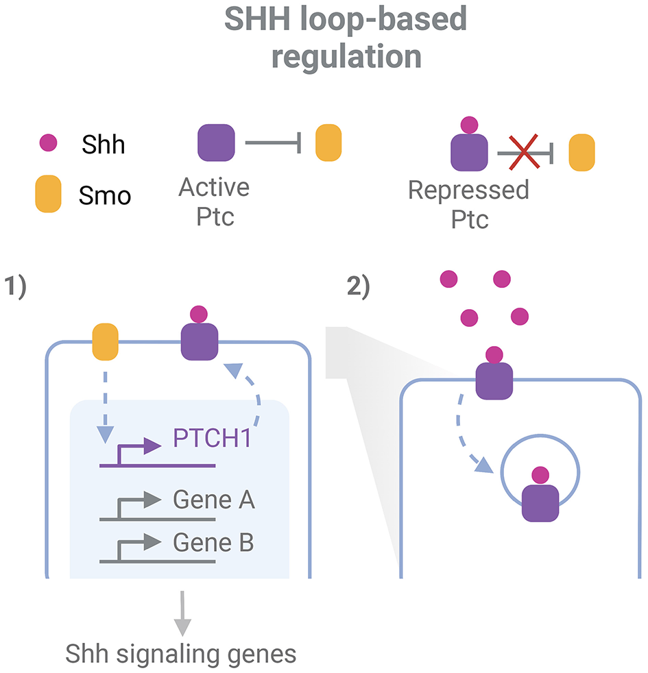 Example of network-level robustness for the action of a morphogen in neurodevelopment. Two feed-back loops participate in the robustness mechanism for the cellular responde to Shh in the neural tube: 1. Smo indirectly induces transcription of the PTCH1 gene. This gene codes for the protein Ptc, which represses Smo activity and is inhibited by Shh binding; 2. After Shh binding, Ptc mediates its endocytosis and degradation. Inspired in Sagner and Briscoe (2017) and Ferent et al. (2019). Created with BioRender.com.