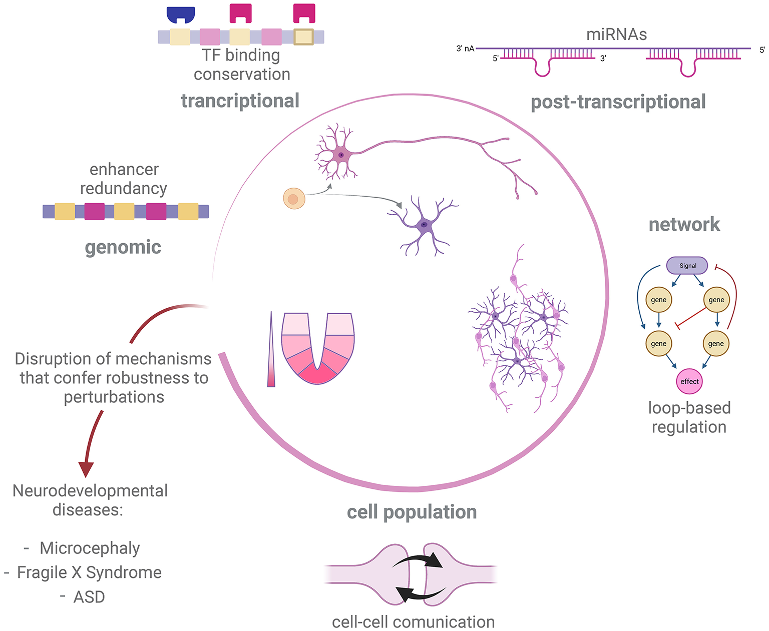 Robustness mechanism underlying development of nervous system. Development of the nervous system in different metazoan species is tuned by distinct but overlapping regulatory processes, such as sensing of morphogen gradients, cell-cell communication and GRN governing cell fate decisions. In order to correctly deliver such a complex output, different strategies promote robustness against internal or external perturbations at different levels of regulation. Disruption of robustness mechanisms could impair success of some of these developmental processes and therefore trigger neurodevelopmental disease and abnormal conditions, such as microcephaly, Fragile X Syndrome and ASD. Created with BioRender.com.