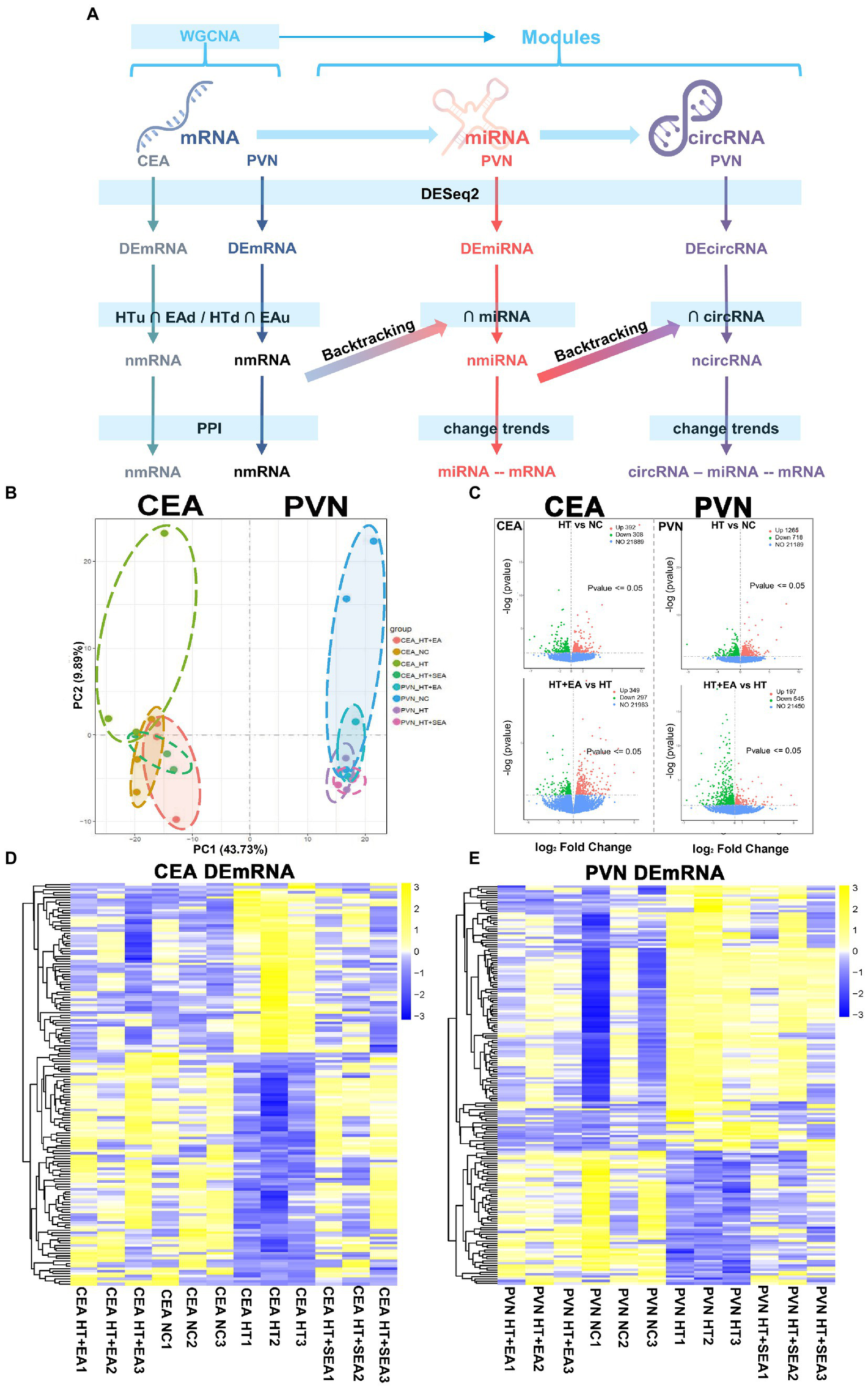 RNAseq was used to investigate changes in gene expression profiles in the central nervous system after HT and EA treatment (Figure 2A). The two crucial neuroendocrine nuclei, CEA and PVN, were used to construct the circRNA-miRNA-mRNA interaction network and for the further network analysis. The CEA and PVN were clearly distinguished in the PC1 dimension of the PCA, and different subgroups including NC, HT, HT + EA, and HT + SEA were also independently clustered (Figure 2B). The DEmRNAs were further screened by DESeq2 and shown in volcano plots (Figure 2C). A total of 1,246 DEmRNAs were identified in the CEA, with 392 up-regulated (HTu) and 308 down-regulated (HTd) comparing the HT and NC group, and 349 up-regulated (EAu) and 297 down-regulated (EAd) comparing the HT + EA and HT group (Supplementary Sheet 1). A total of 2,725 DEmRNAs were identified in the PVN, with 1,265 HTu, 718 HTd, 197 EAu, and 545 EAd (Supplementary Sheet 1). A hierarchical clustering heatmap showed a similar gene expression pattern between the NC and HT + EA groups, while obvious differences were observed comparing HT with either the NC or HT + EA groups (Figures 2D,E). Taken together, it appeared that the effect of EA on alleviating surgery-induced HPA axis hyperactivity was correlated to the gene expression profiles in the CEA and PVN.