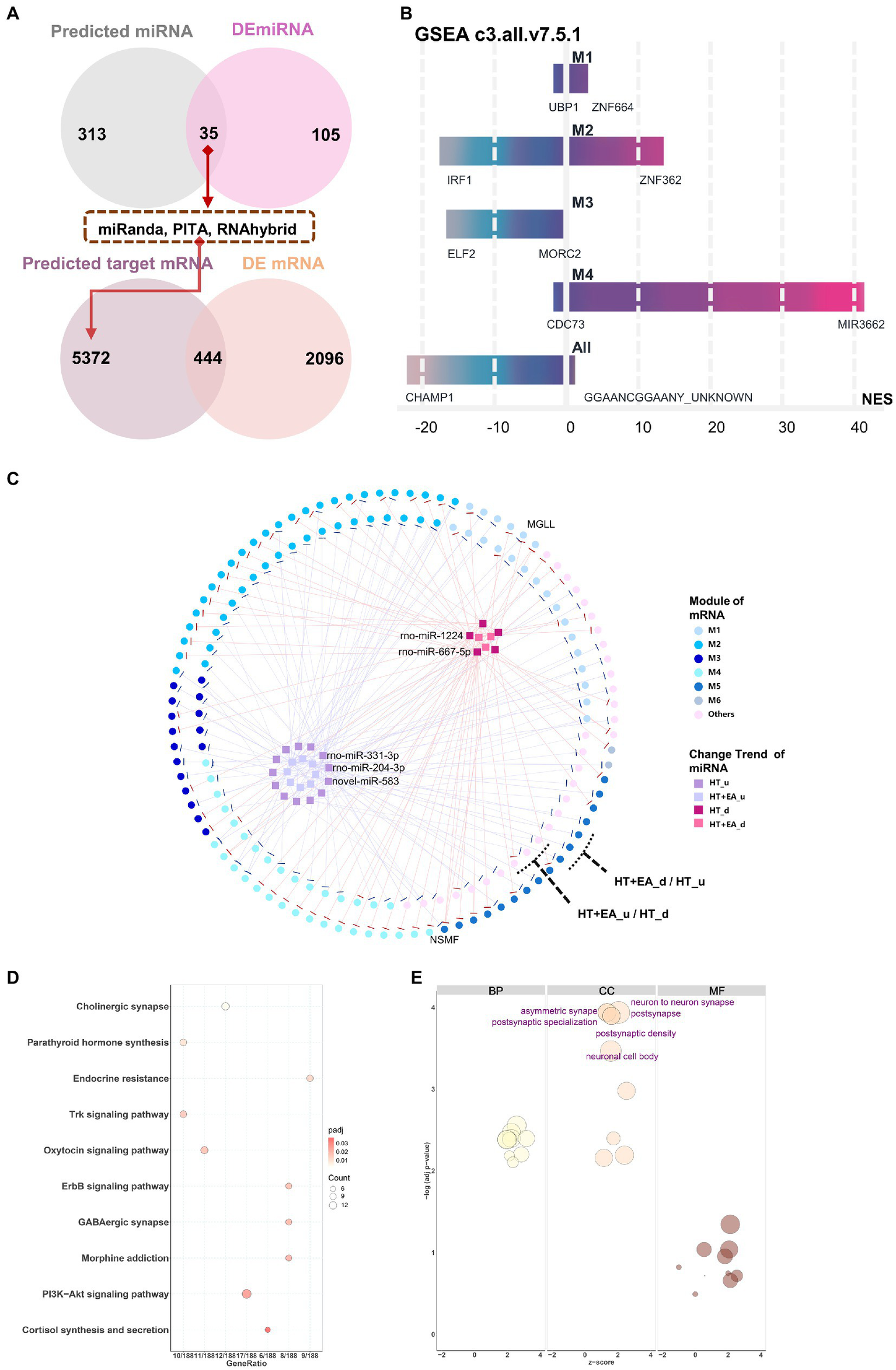 Interaction networks of nmiRNAs and functional enrichment analysis. (A) The data flow shows the overlaps for filtering out the nmiRNAs and the targeted genes. (B) Potential gene target prediction for six modules using the GSEA curated gene set C3 database (Molecular Signatures Database v7.5.1). M5 and M6 were omitted because of the small number of genes in the sets. (C) Interaction networks showed miRNAs with different change trends distributed among the six gene modules, including HT up-or down-regulated (HTu and HTd) and EA up-or down-regulated (EAu, EAd). The top 5 weighted miRNAs were labelled based on their degree of connection with mRNA. (D,E) KEGG and GO functional enrichment analysis of miRNA-targeted mRNAs.