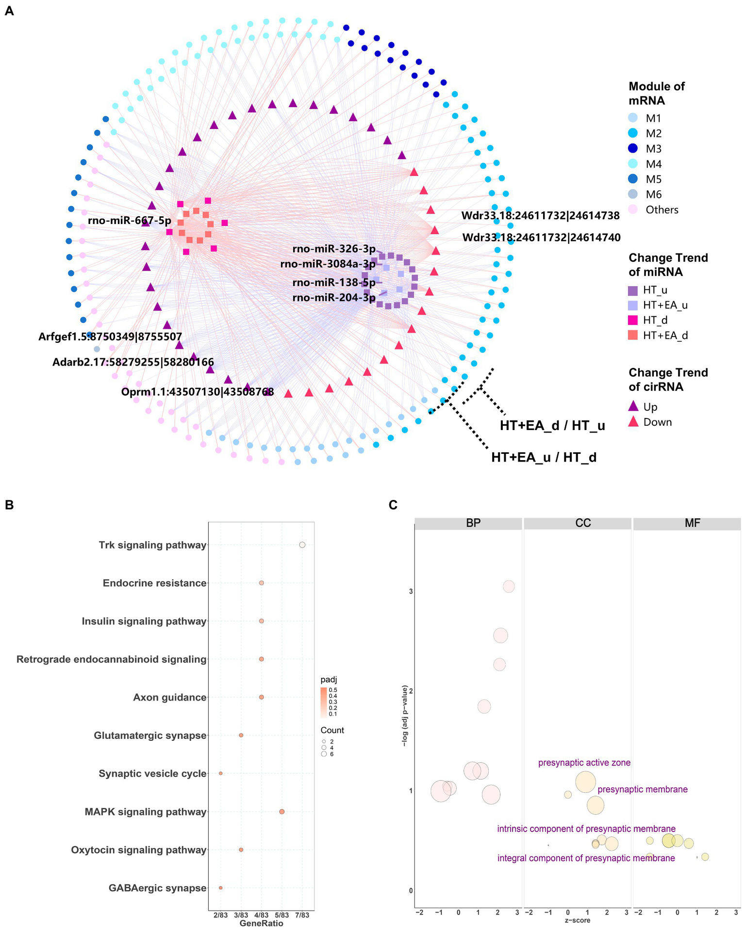 Functional enrichment analysis was also performed for the target genes regulated by ncircRNAs. KEGG analysis showed several more specific types of synapses, including endocannabinoid and glutamatergic synapses, as well as the Trk, insulin, and MAPK signaling pathways (Figure 6B). On the other hand, GO cellular component terms were shown to be related to presynapsis (Figure 6C), indicating that circRNAs regulate different aspects of cellular activities compared with miRNAs.